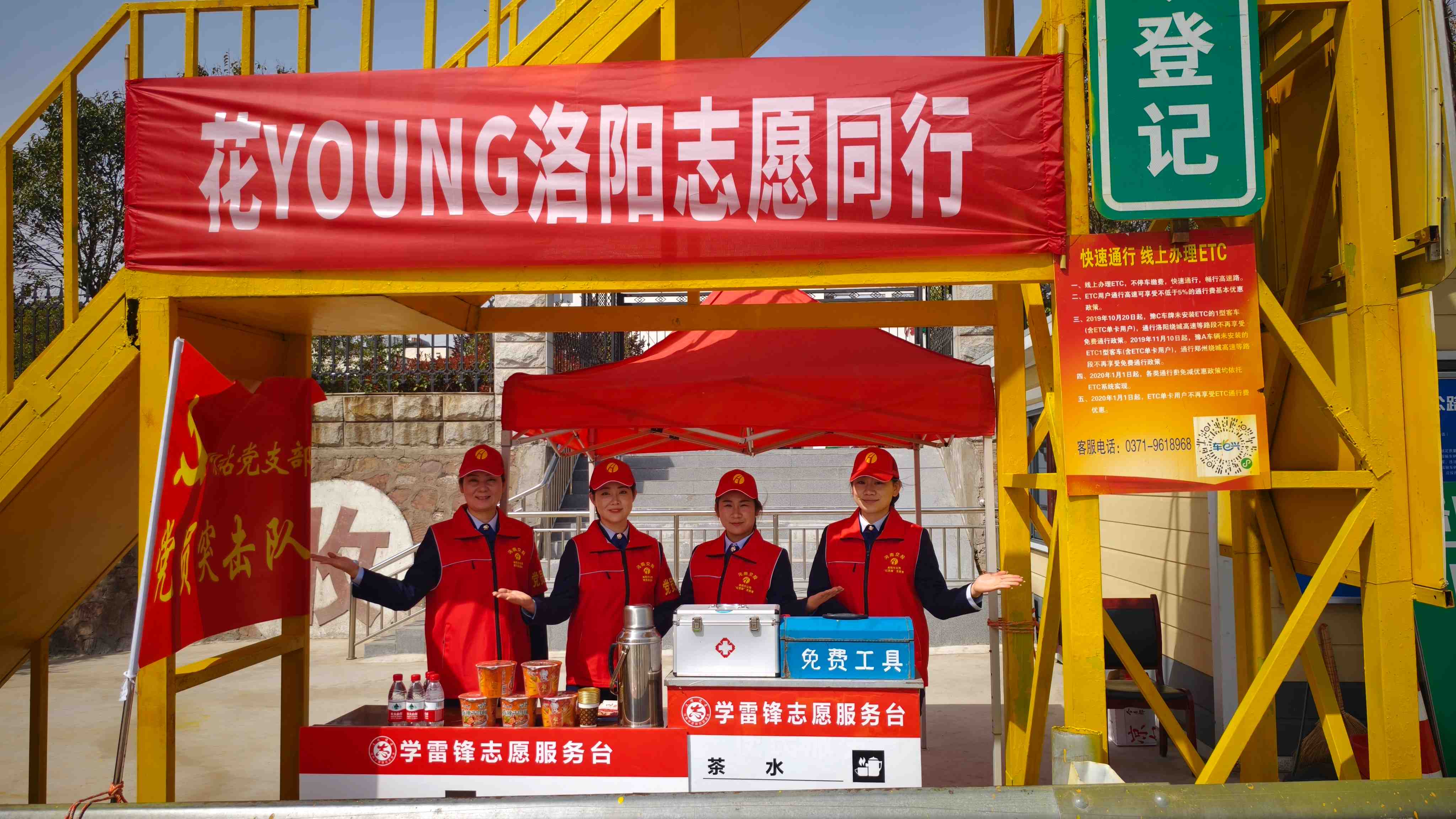 志愿者们以“服务态度优、服务技能优、服务效率优、服务举止优、服务环境优”为标准,全面升级服务品质:在收费站区统一悬挂“花YOUNG洛阳志愿同行”横幅,栽种牡丹花卉、营造"花满洛阳"的通行环境;设立学雷锋、党员、青年志愿者便民服务台,完善配备急救箱、工具箱、开水、充电宝等便民设施;开展"微笑服务"培训,用标准的礼仪手势和亲切问候,让游客感受"家"的温暖。