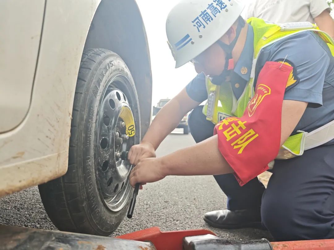 中午11时,烈日炙烤下,一位司机因轮胎故障困在洛卢高速 38公里处。党员突击队接报后第一时间赶赴现场,顶着高温熟练操作,汗水浸透衣衫仍专注作业,短时间内便更换好轮胎,助司机顺利返程。