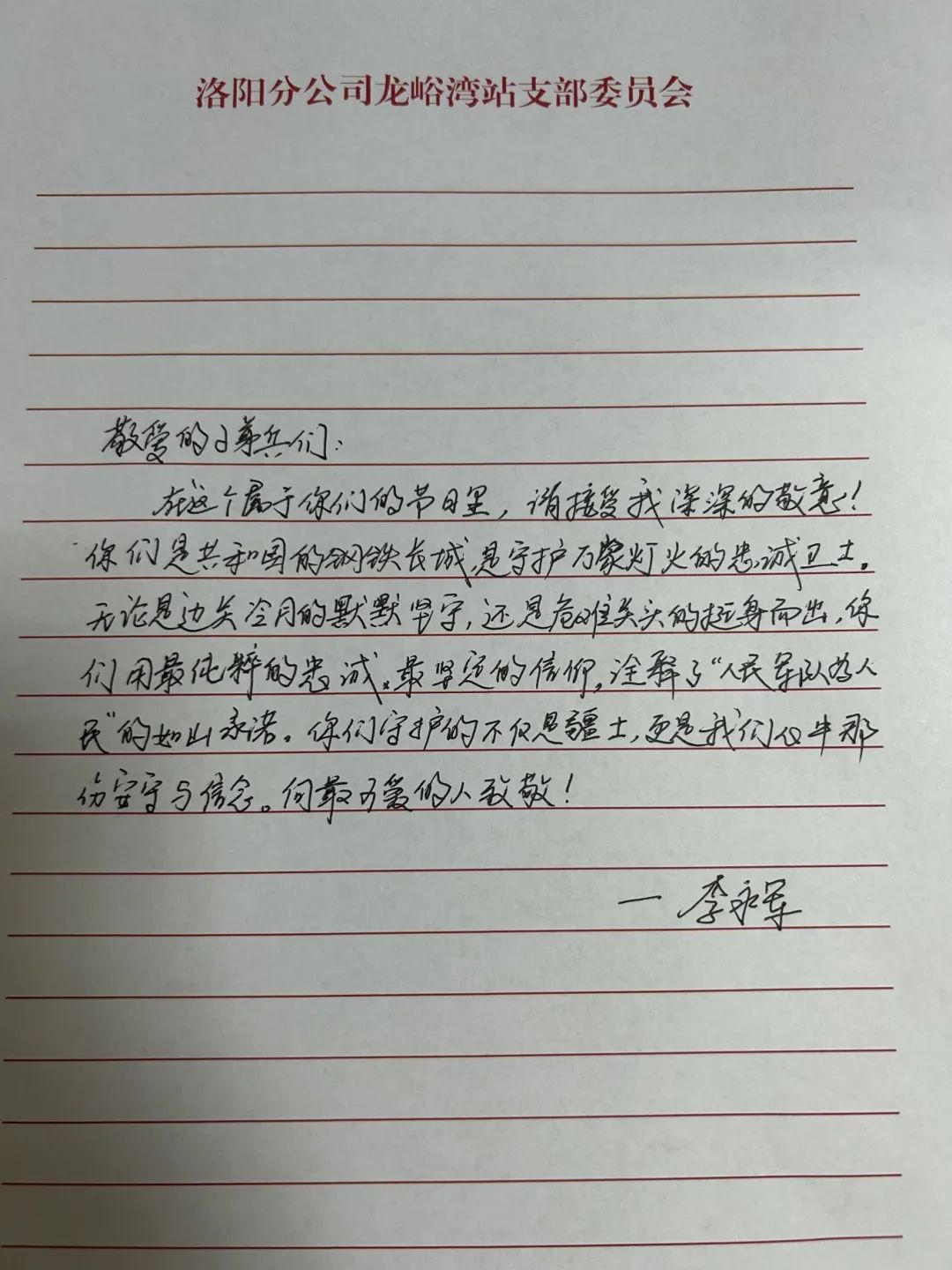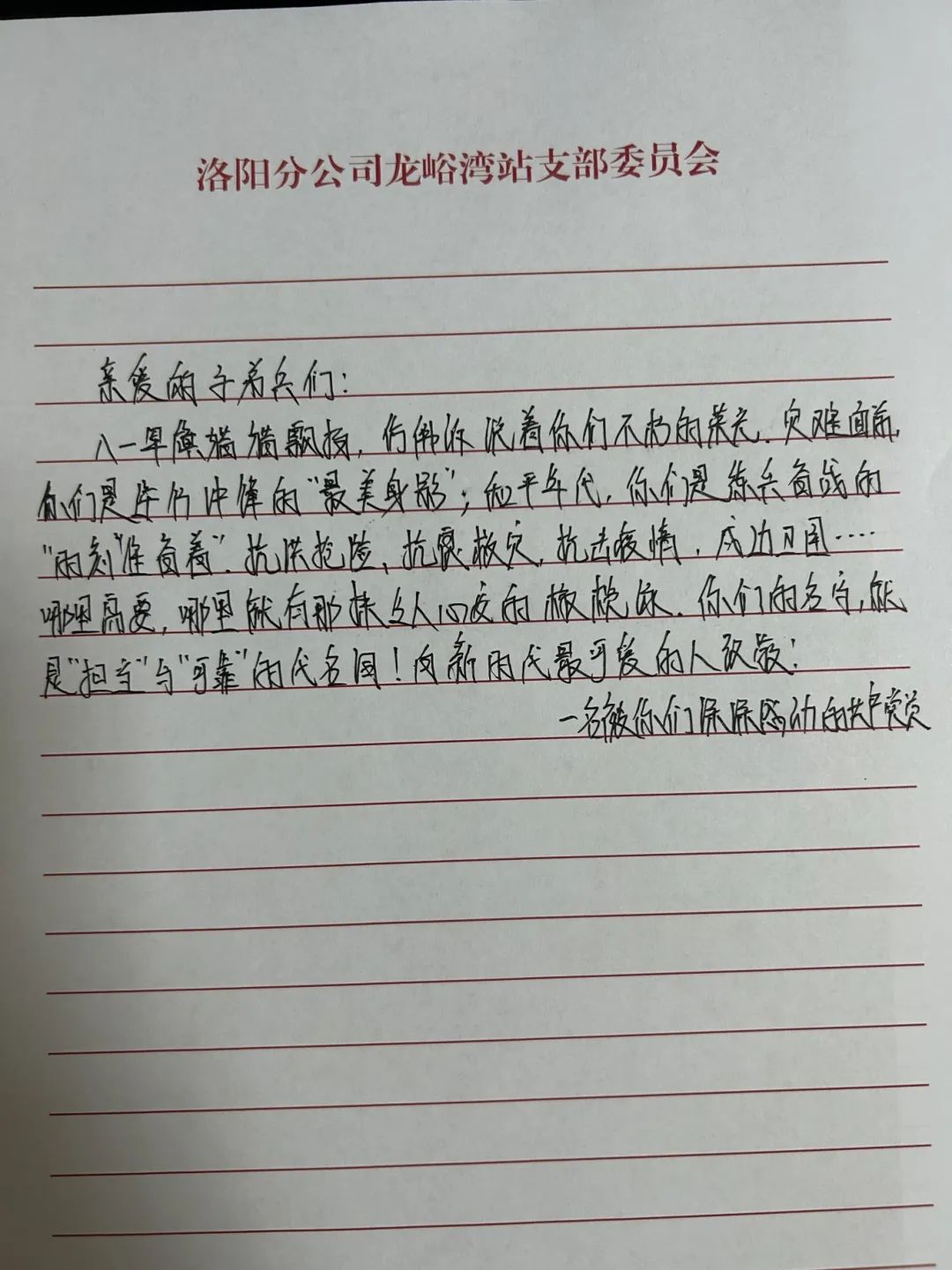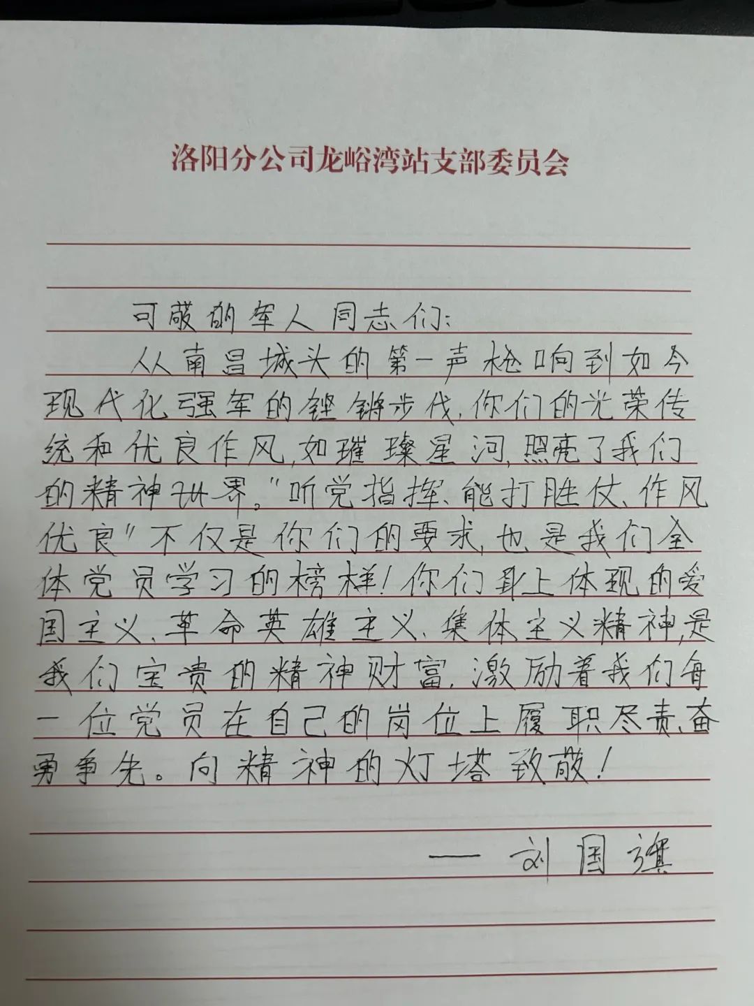单位:党群工作部、所属相关党支部 发布时间:2025-08-04在建军98周年之际,洛阳分公司各党支部积极开展“传承红色基因,弘扬军人精神”系列活动。白云山站、龙峪湾路产外勤中队、木札岭站党支部组织党员观看《建军大业》《八一南昌起义》红色影片,重温人民军队创建历程,感悟革命先辈信仰与担当;龙峪湾站党支部开展“我给可爱的人写心声”活动,党员以书信致敬军人,深化军民情谊;洛阳站党支部召开座谈会,退役军人分享军旅与岗位故事,凝聚奋进力量。系列活动强化了党员使命意识,激励大家立足交通岗位,践行初心使命,为高速事业发展贡献力量。