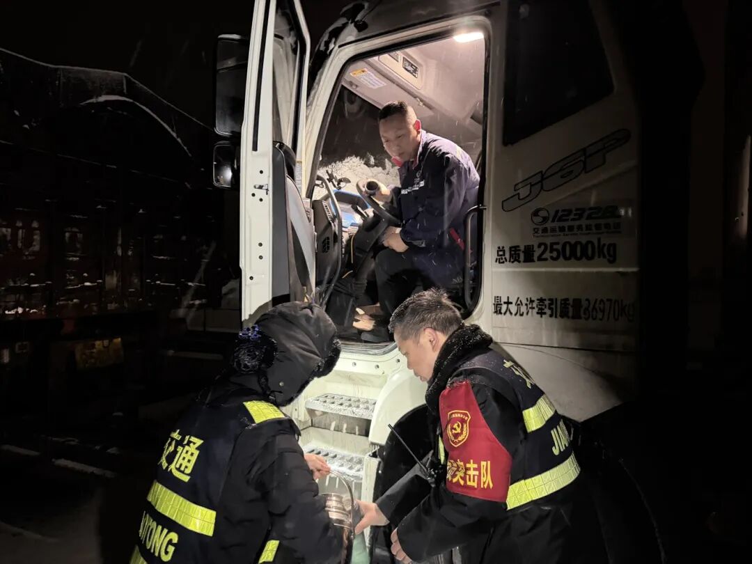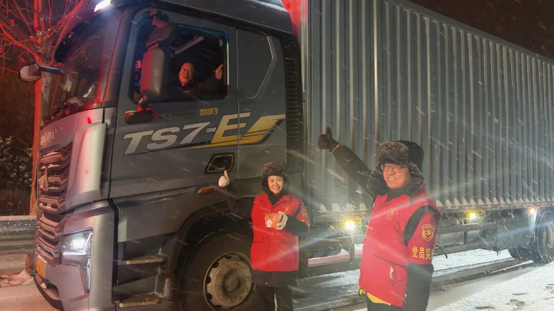 会盟站党支部:暴雪致司乘滞留,党员突击队队员在寒夜中奔波,为滞留司乘送上泡面、火腿肠及热水,耐心传递温暖,在冰封前路中搭建起暖心桥梁,让归途满含温情。