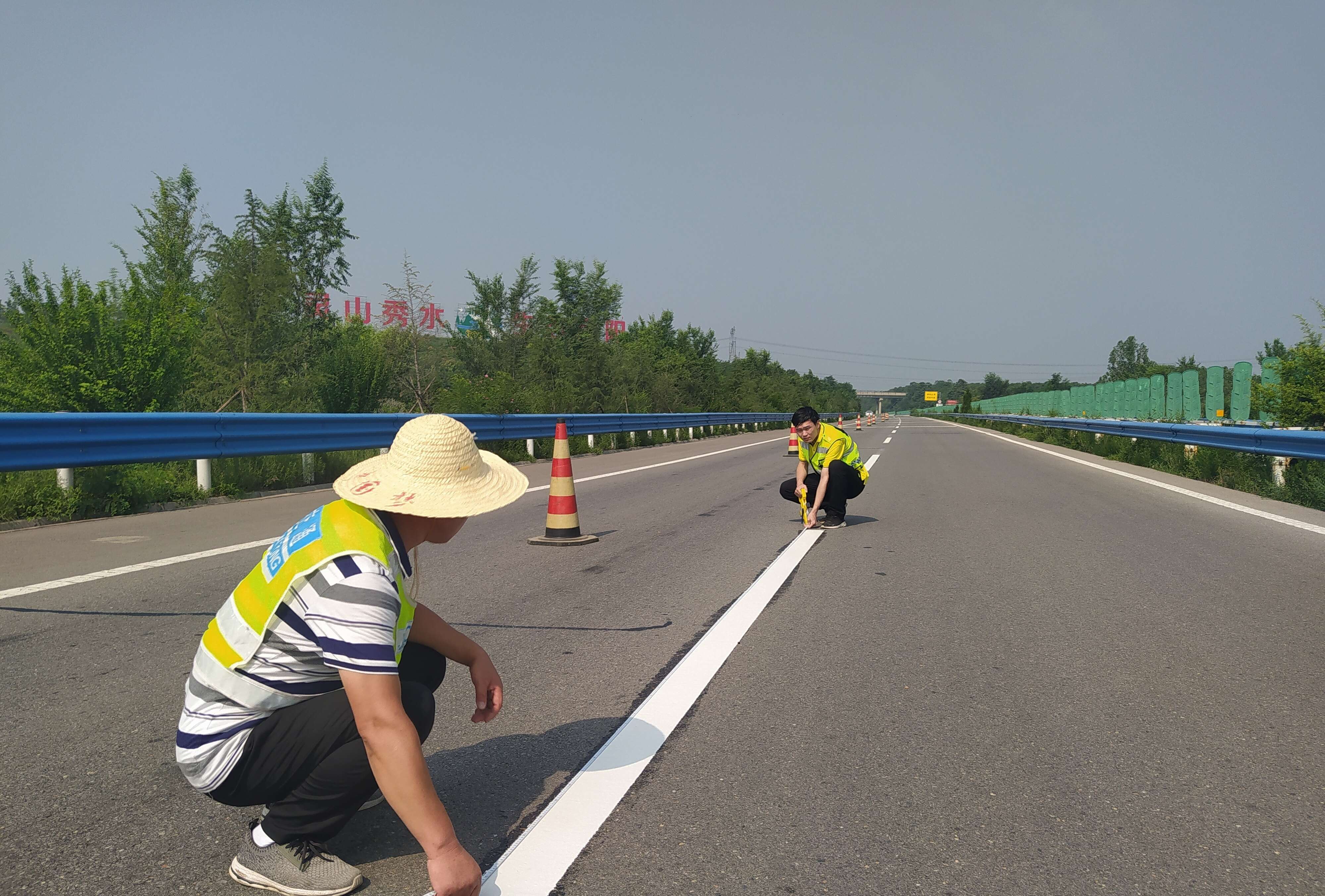为保证洛卢高速上行K0-K1+500、下行K14+500-K5+980行车道分界线施工标线施工质量,周山养护管理所交安负责人对现场施工进行跟踪测量,所抽查测量标线长600cm,宽15cm,间隔900cm规格均符合施工要求。