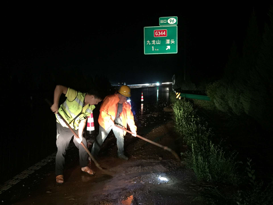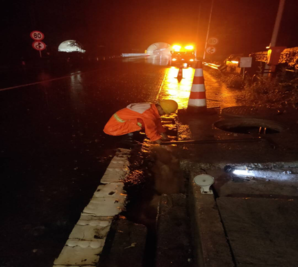 2020年8月1日夜间,嵩栾段突降大雨,九龙山养护所加密巡查频次,对山区路段易落石高边坡、易滑塌土质边坡、路面易积水等重点部位进行重点排查。对因强降雨造成的淤泥、落石以及边坡滑塌情况第一时间进行处置清理,保证了道路的安全。