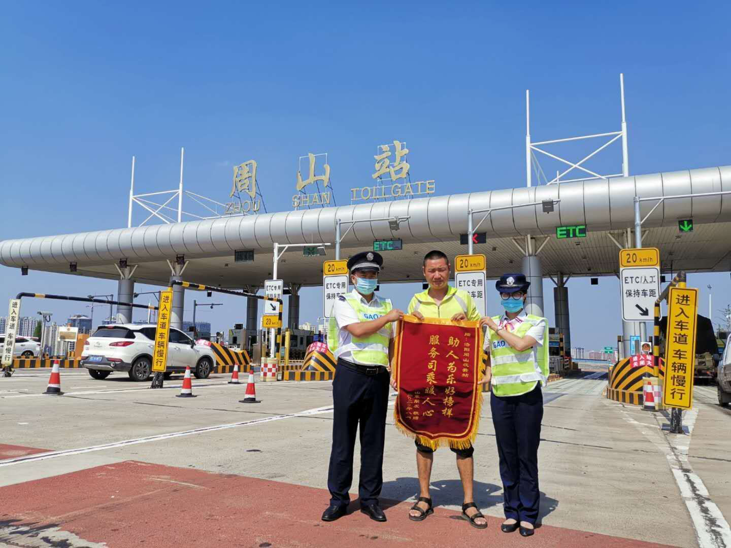 一货车通过周山收费站时后门挂钩损坏,所装载西瓜掉落,紧急情况下,周山收费站组织所有在站职工帮助车主对西瓜进行转移,由于处置得当,及时帮助车主避免了货物损失,为表示感谢,8月10日上午,司机特意赶来送上了一面锦旗。