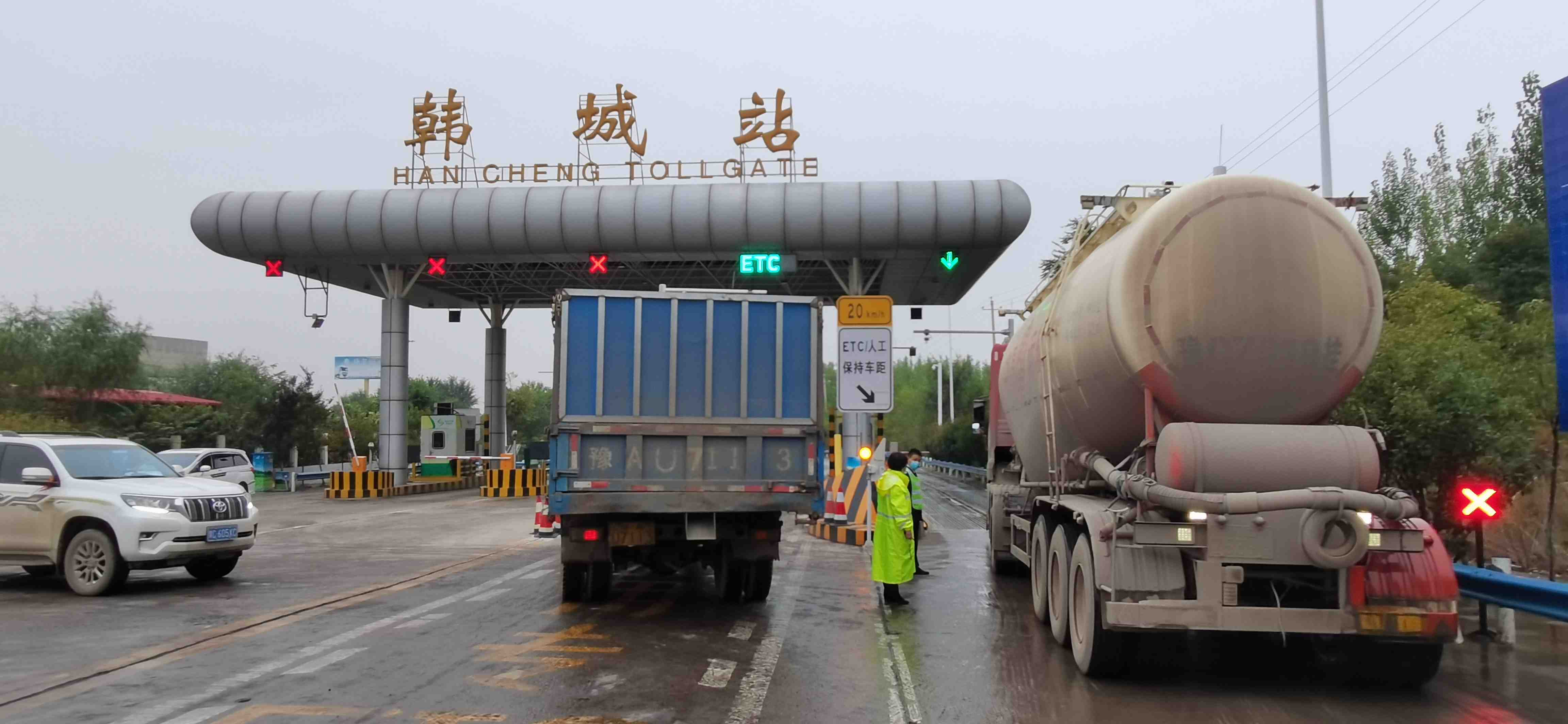 10月12日中午,因连霍高速(G30)三门峡段k822道路施工双向无法通行,造成韩城收费站货车车流量短时间内骤增,韩城收费站全员出动,指挥疏导车辆,确保车道畅通。