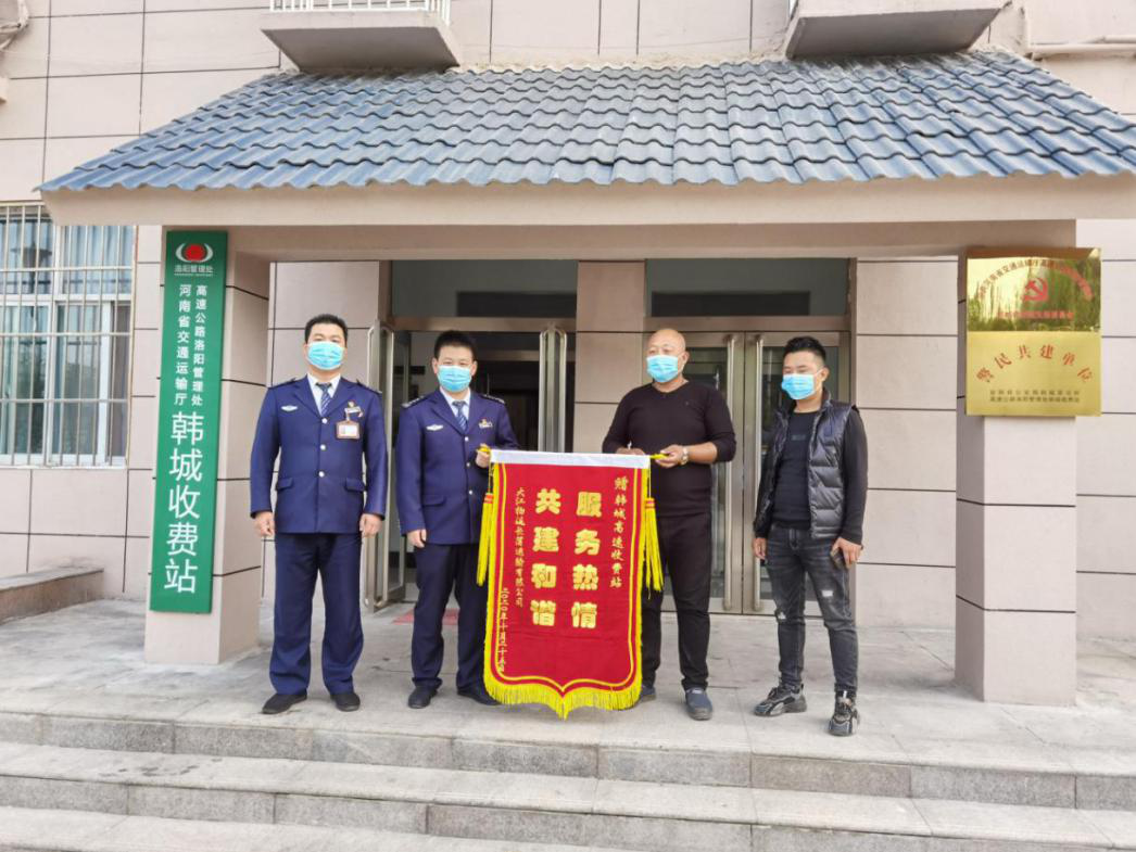 为感谢韩城收费站在大件运输车辆通行保障方面的热情周到服务,10月29日下午,大江物流两位负责人给韩城收费站送来一面锦旗表达谢意。大件运输车辆在韩城收费站通行较多,韩城收费站针对大件运输车辆,制定了专门的保通方案预案,并提供热情周到的服务,保障车辆快速安全通过收费站,受到了运输企业和广大司乘的广泛好评。