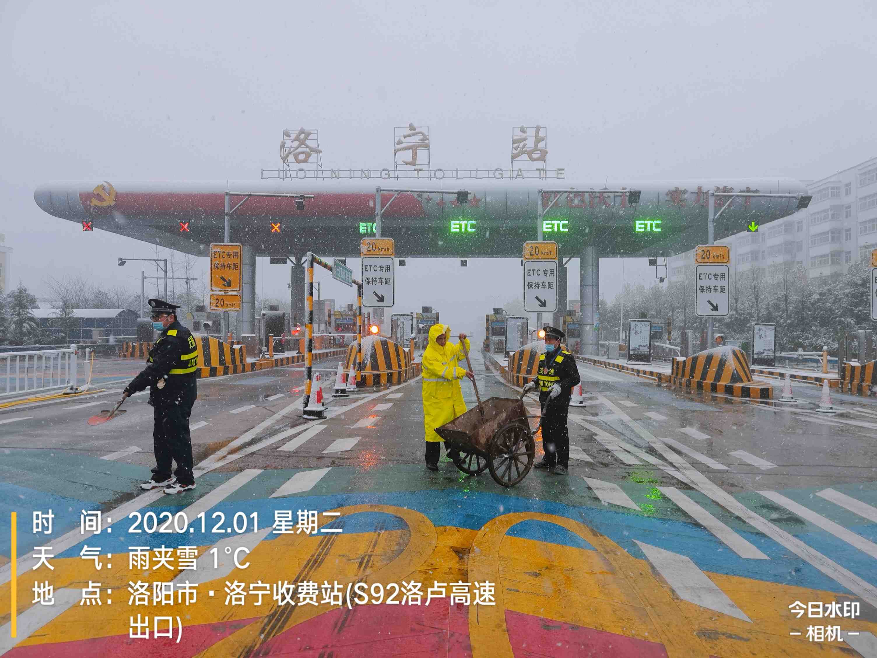 单位:收费管理科 发布时间:2020-12-0112月1日,洛阳迎来了入冬以来的第一场大雪,部分收费站地面有积雪,路面甚至出现结冰情况,为保证雪停地净,为司乘人员提供一个安全的行车环境,各收费站第一时间组织人员进行除雪保通,除雪小分队不畏严寒,分工明确,协同配合,立即投入,迅速行动,铲雪融冰,确保道路安全畅通。同时为司乘人员免费提供开水、常用药品、维修工具等便民服务。
