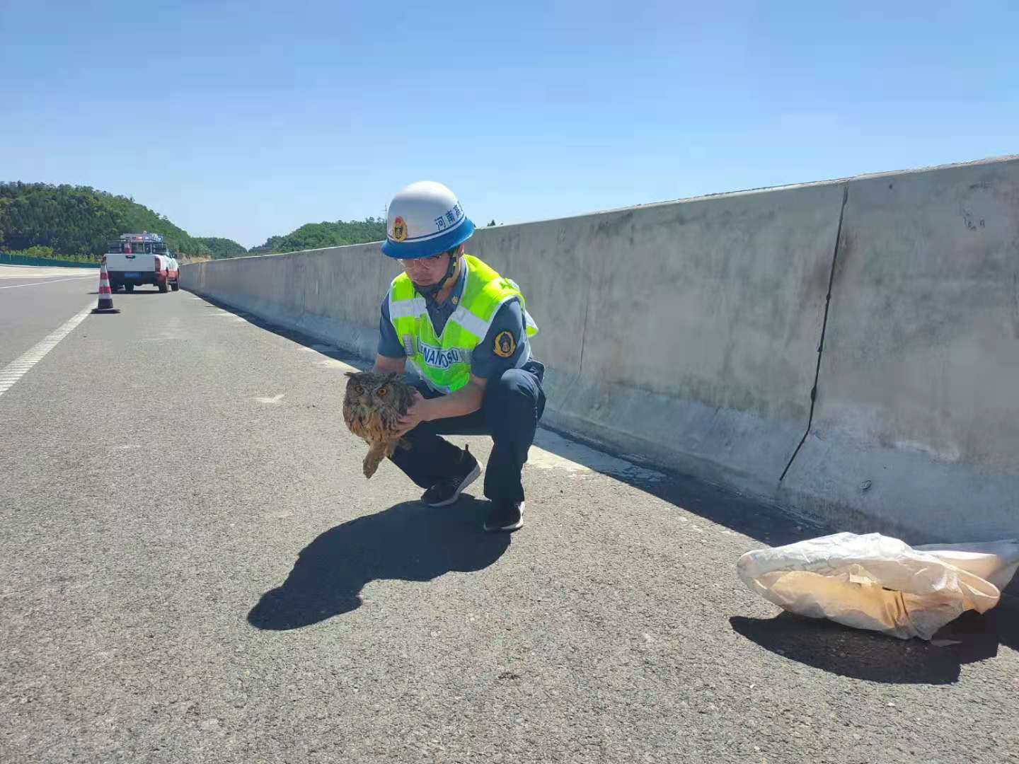 6月4日上午10时16分左右,洛宁路产管理大队巡逻至洛卢高速103公里处,发现一只受伤猫头鹰在路边挣扎,队员立即停车,对其进行救助,并积极联系有关部门寻求医疗救助,最终与当地林业局取得联系,林业局同志将其带走做进行进一步治疗。