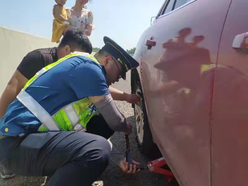 单位:宜阳路产大队 发布时间:2021-07-137月12日10时20分,宜阳路产大队巡查至S92洛卢高速K45+800m(上行)处,发现应急车道内滞留一辆小型客车,巡逻人员立即停车上前查看询问,该车辆因轮胎损坏无法行驶,车内一名妇女抱着三岁女童,正焦急不知所措,路产队员了解情况后迅速设置安全区,利用巡逻车随车带的工具帮助司乘人员更换轮胎,经过20分钟顺利换好轮胎。