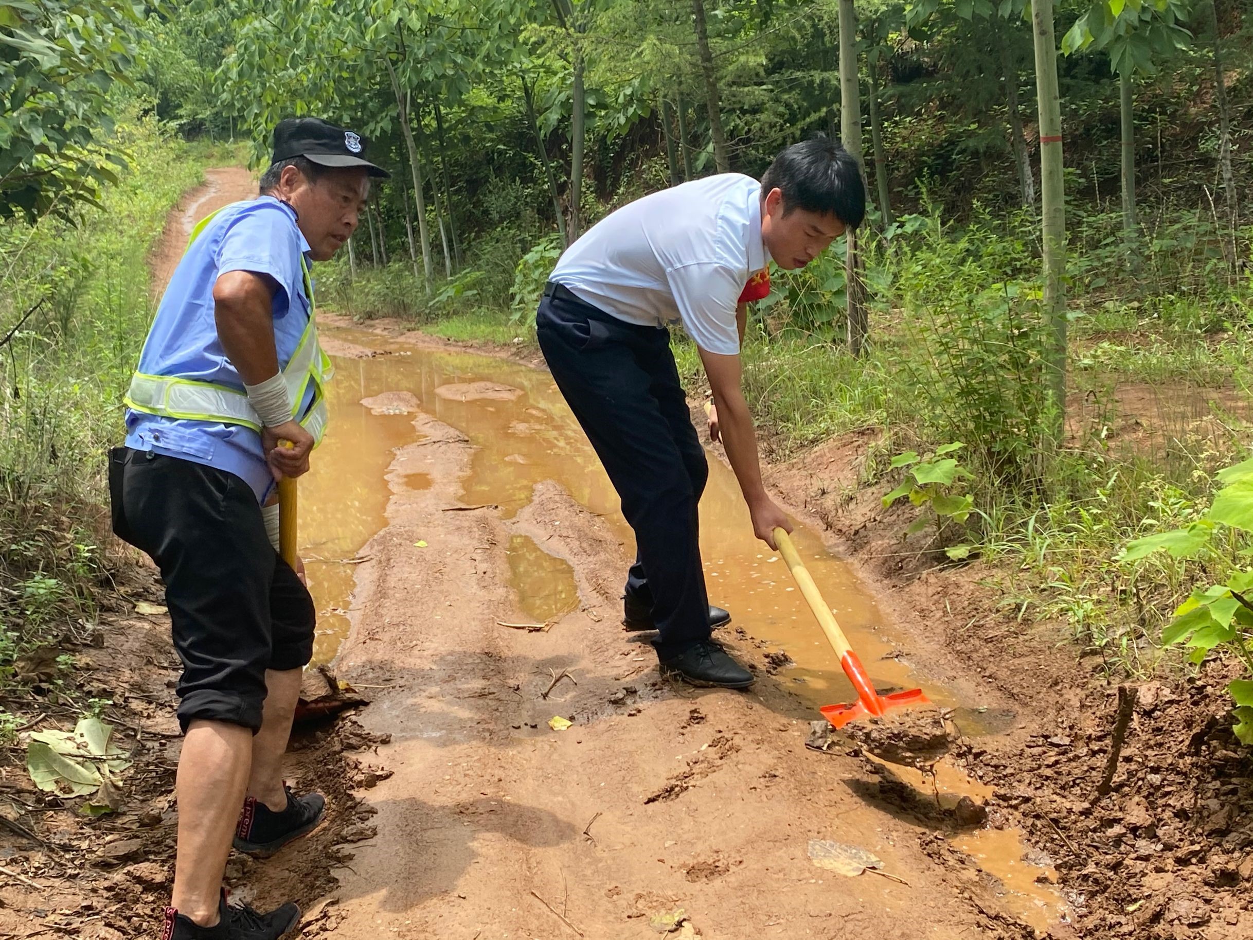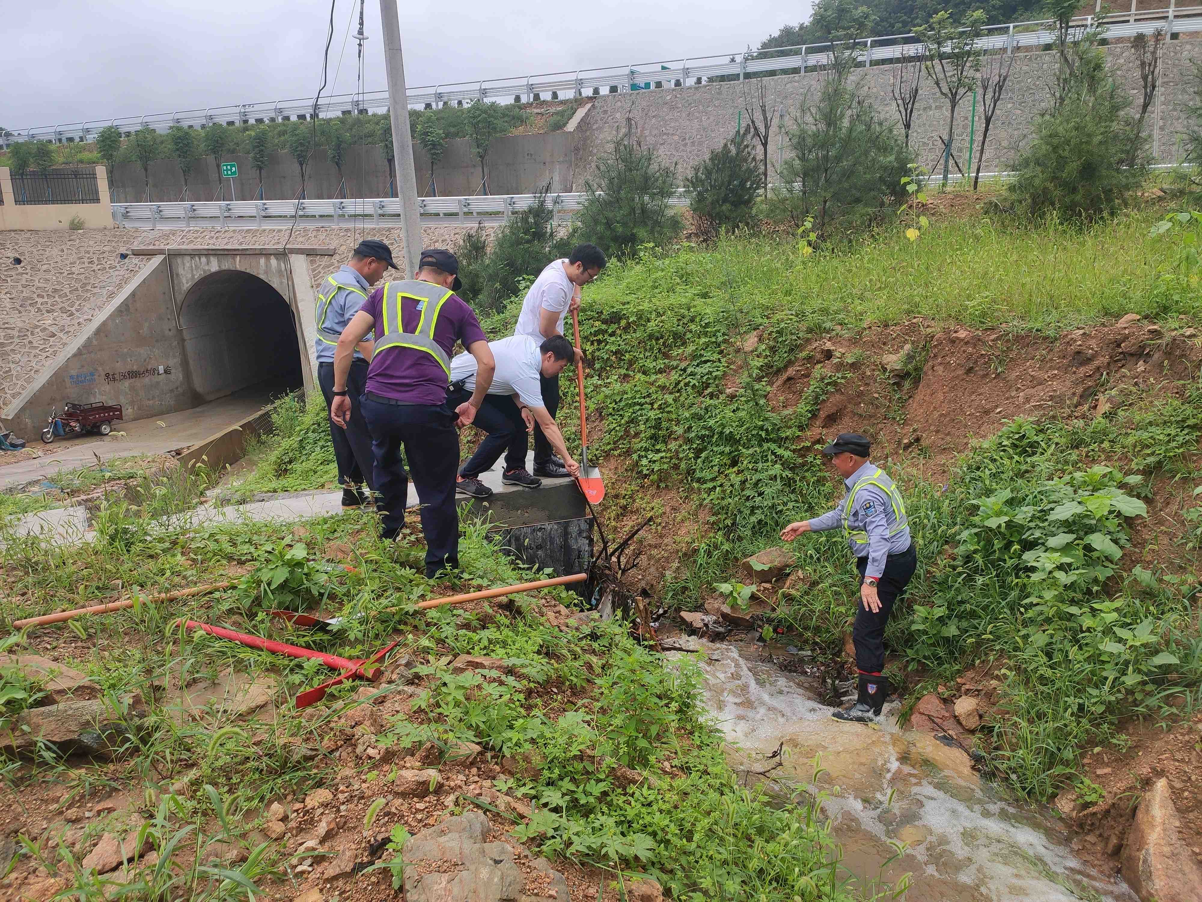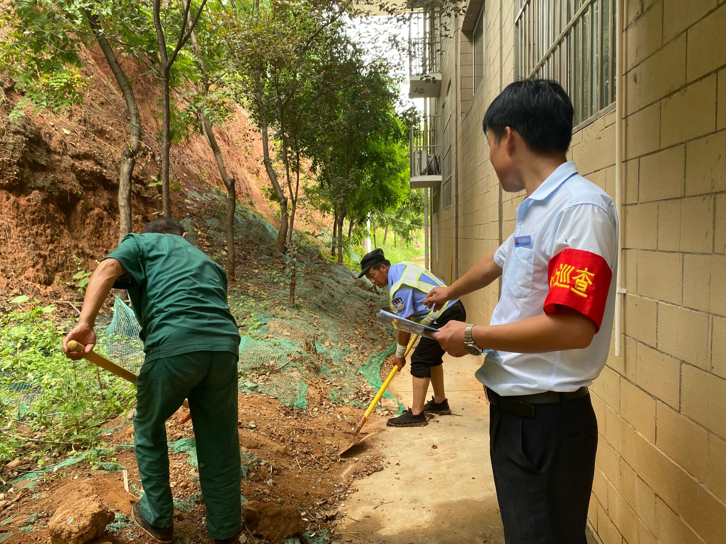 旧县服务区 组织员工开展雨后安全巡查,安全人员带领工勤对服务区综合楼后坡雨后积水进行清理疏通,及时消除安全隐患。