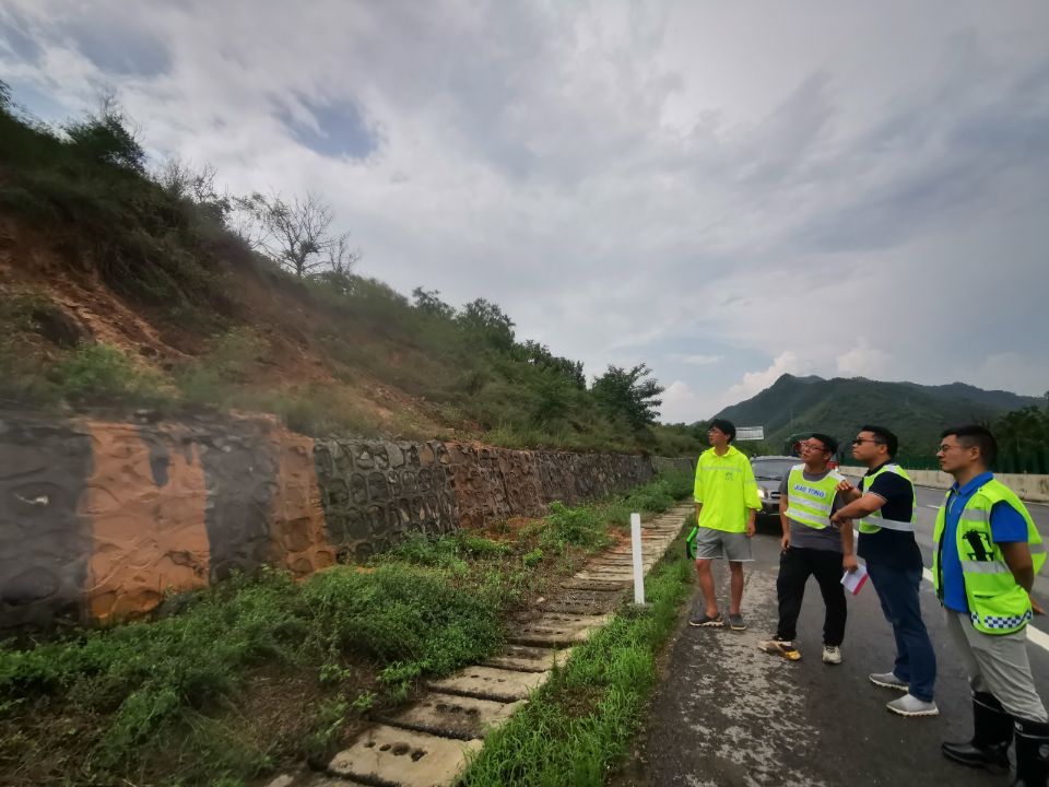 单位:九龙山养护所 发布时间:2021-07-267月24日下午,洛栾高速九龙山养护管理所会同分公司养护管理部、省交通规划设计研究院专家人员冒雨对嵩栾段近期水毁地段进行了实地勘查。针对边坡滑塌、防护损坏和路面积水等重点病害的成因、规模及处治措施等进行了现场讨论,形成了处置方案,为路段下一步汛期防范和水毁修复工作的顺利展开奠定了基础。