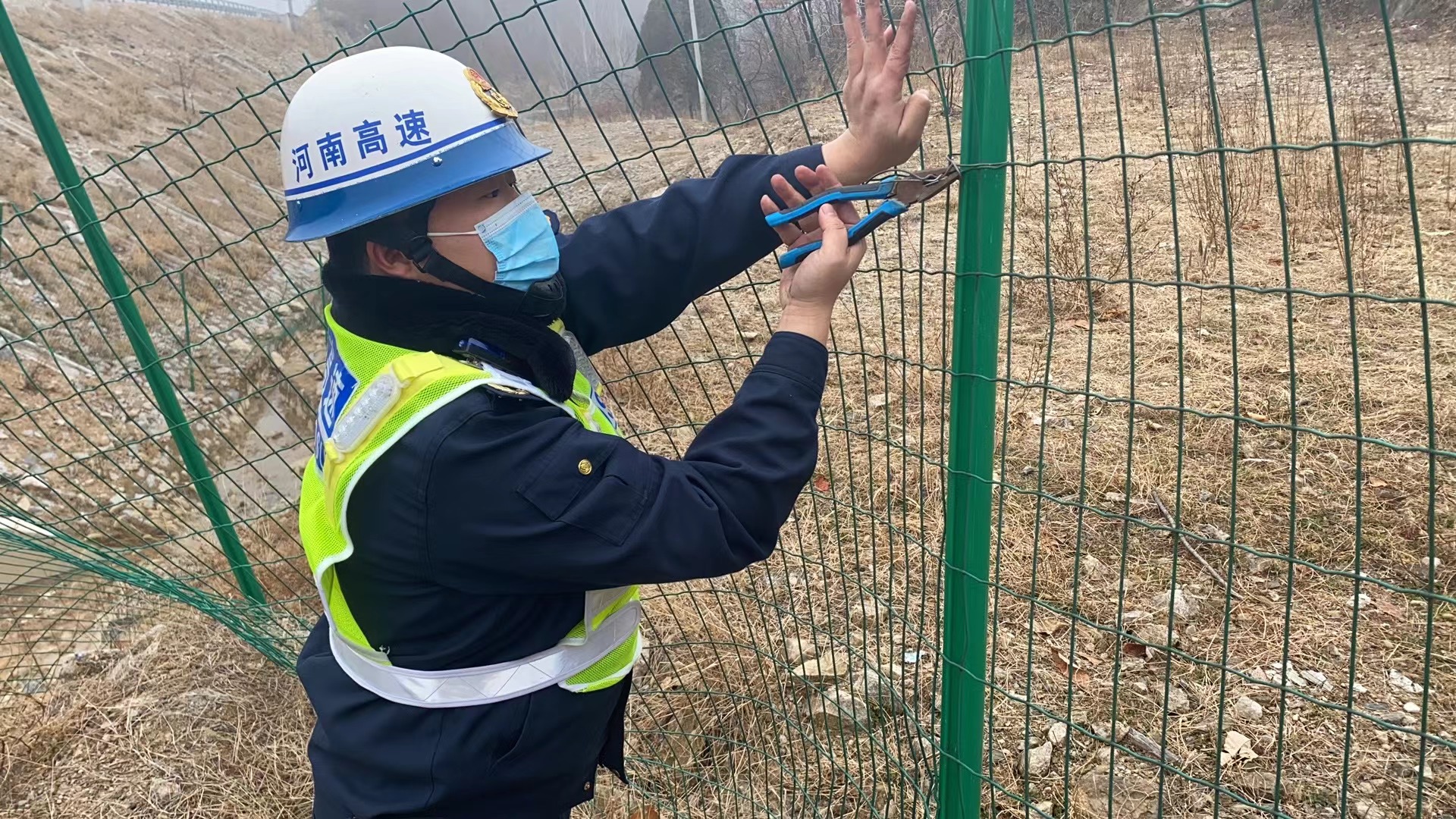 单位:尧山西路产管理大队 发布时间:2022-01-112022年1月11日,交发集团洛阳分公司尧山西路产管理大队开展第一季度的徒步巡查工作,对辖区内交安设施进行认真排查,保障高速公路沿线交安附属设施完好。徒步巡查中,路产管理人员发现隔离栅存在倒伏情况。为保证防护设施完好,防止行人或养殖牲畜进入高速公路内,路产管理人员使用随车携带的钳子、铁丝对破损的隔离栅第一时间进行维修。维护了高速的封闭性和安全性,更好的保障了郑栾高速尧栾段的安全畅通的通行环境,为广大司乘人员提供安全畅通的行车环境。