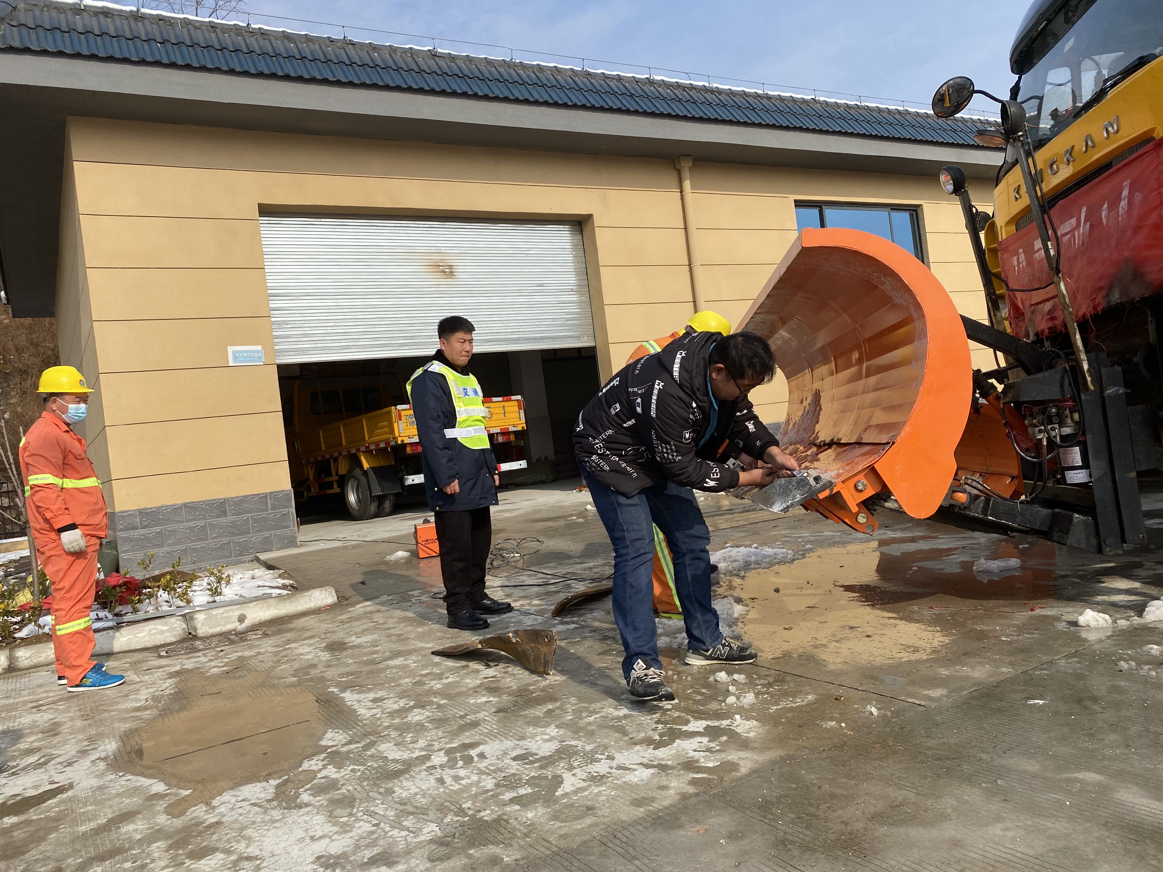 单位:尧山西养护所 发布时间:2022-01-25持续奋战除雪融冰近一周,尧山西养护管理所除雪设备推雪铲、融雪剂撒布机、保通车辆连续高效运转,高负荷连续工作使设备存在铲板螺丝松动、变形损坏、撒布机低温漏油、保通车轮胎损坏等一系列影响除雪工作效率的设备问题。雪后初晴,尧山西养护管理所利用停雪晴天,全力以赴,抢抓停雪空档期检修除雪设备,第一时间组织养护检修人员针对除雪融冰机械设备进行检修、改进、更换,为迎战下一轮除雪融冰、提高除雪效率、保障春运期间道路安全畅通做好充分准备。