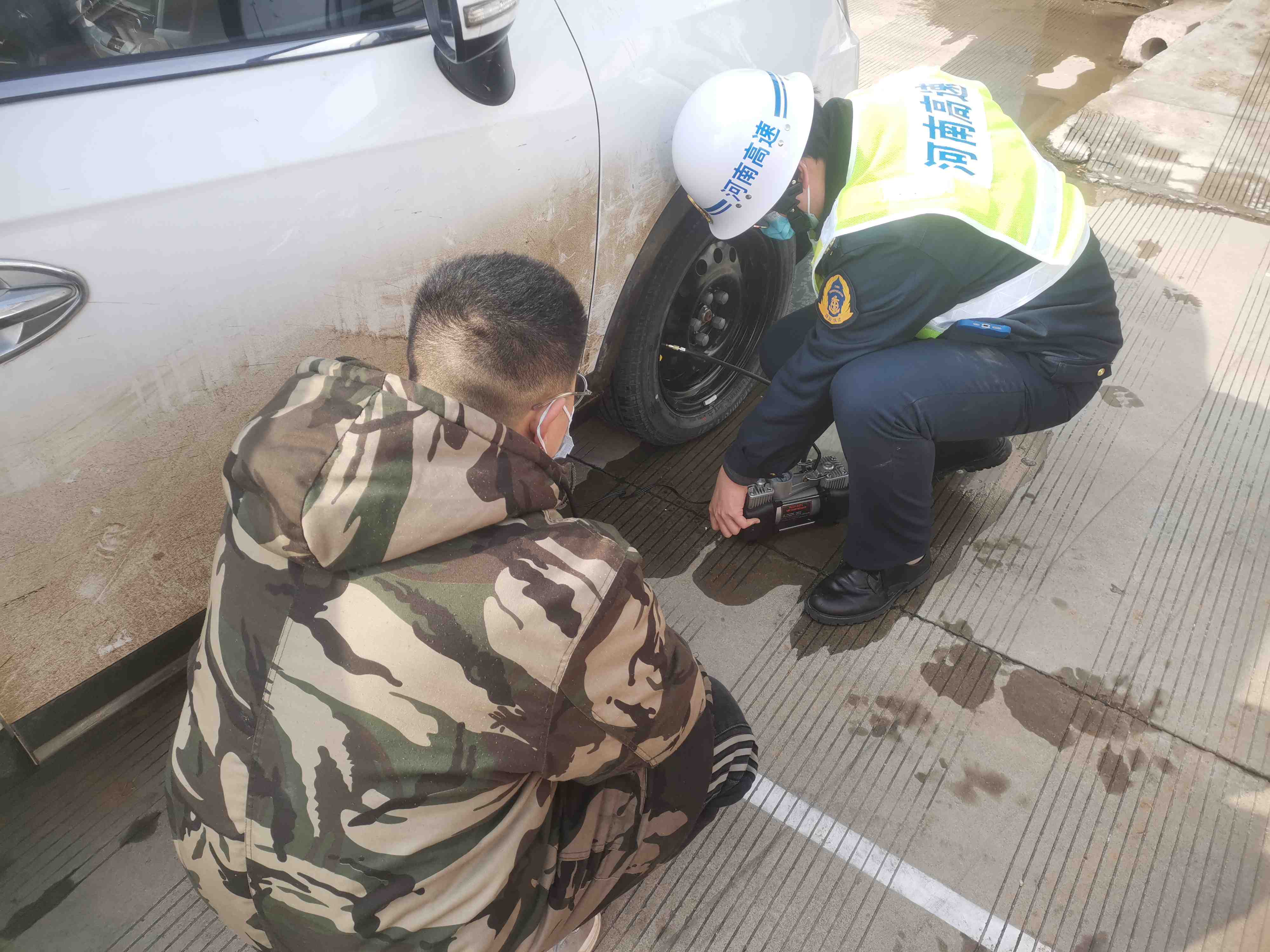 单位:栾川路产管理大队 发布时间:2022-01-261月25日12时55分栾川路产管理大队巡查人员巡逻至刘坪一号隧道处,发现一辆小型客车停靠在应急车道内,车辆并未开双闪灯,路产人员立即停车上前询问情况,经了解,在行驶途中胎压严重不足,导致无法正常行驶,只能停靠在路边。路产人员告知司乘遇到此情况首先要设置摆放安全区域,打开双闪,以次提醒过往车辆,避免交通事故发生。随即,路产人员立即把故障车辆引导至旧县服务区广场,拿出随车工具,迅速给故障车辆补充胎压,很快恢复正常行驶。
