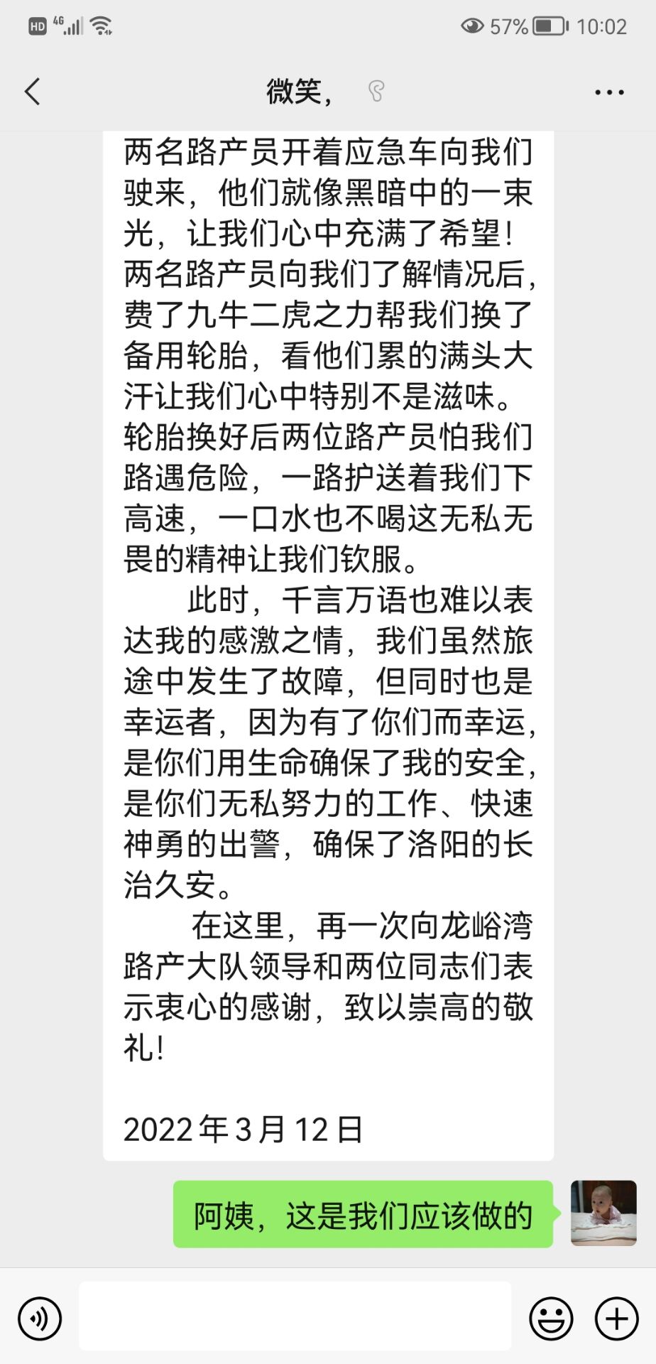 单位:龙峪湾路产 发布时间:2022-03-143月12日18时左右,郑栾高速尧栾段215公里附近一辆白色小型客车因爆胎停在应急车道内,驾驶人正在路边焦急等待,省交通发展集团洛阳分公司龙峪湾路产管理大队巡逻人员发现后,立即对现场设置安全区,将驾驶人引导至安全地带,并取出随车工具帮助司乘人员更换备胎,考虑到驾驶人年纪较大,加上夜间行车存在安全隐患等因素,路产队员一路跟随,将车辆安全护送下高速并对司乘人员进行安全普法教育。