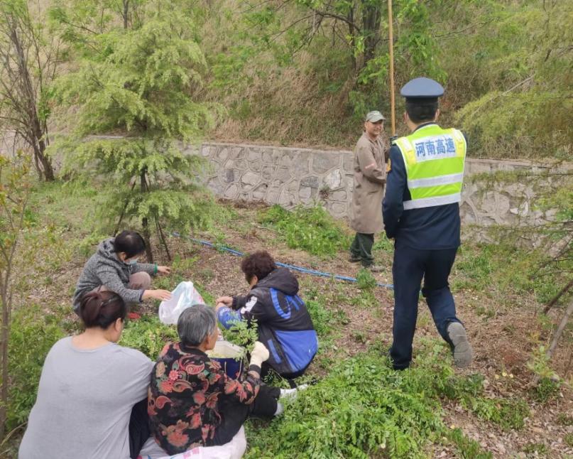 单位:宜阳路产大队 发布时间:2022-04-134月12日15时,宜阳路产管理大队二中队巡逻至k11+600m上行时,发现多人在高速公路护坡边缘使用工具采摘野菜此行为存在安全隐患,经对现场人员进行法制宣传教育、普及相关法律知识后,将其劝离高速。
