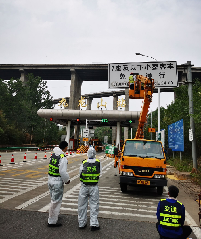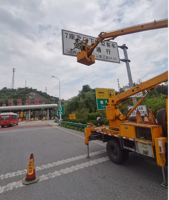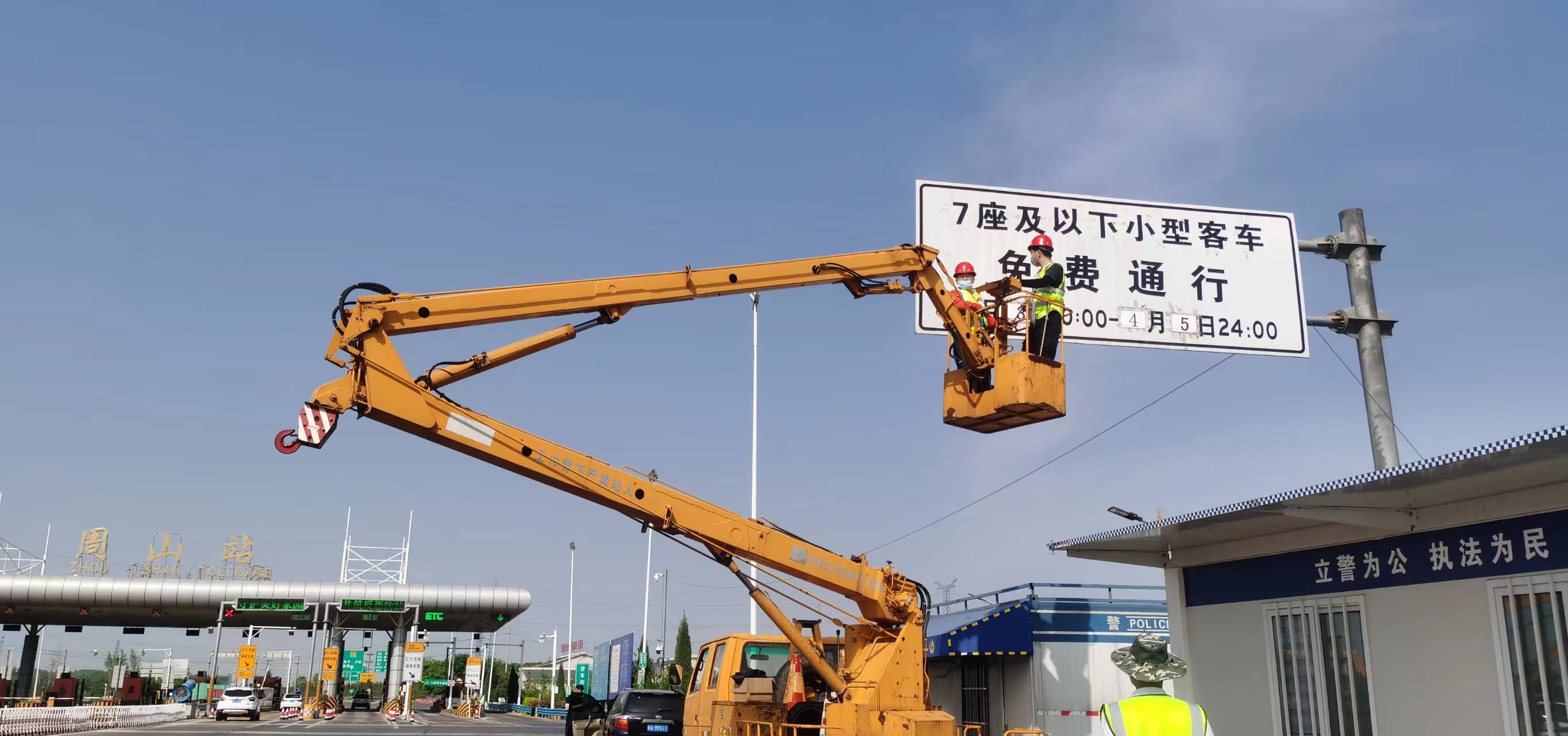 为切实做好五一期间高速公路免费通行保障工作,4月27日,机电运维大队使用登高车对辖区各收费站更换七座以下小型客车免费通行提示标志牌。提示免费通行时间,方便广大司乘人员免费出行。