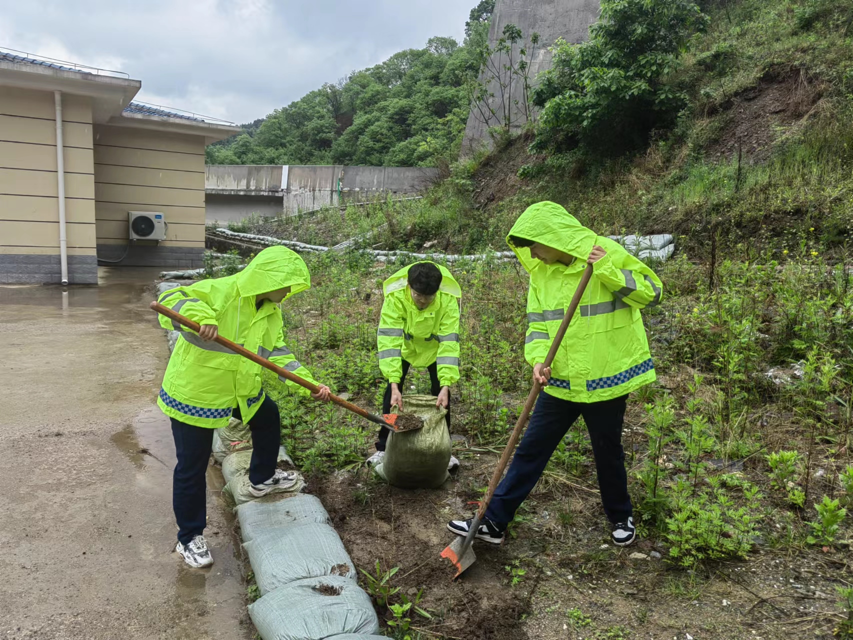 本次演练模拟突遭暴雨,白云山隧道小里程配电房外排水能力不足,水位迅速上涨,配电房前积水,随时威胁配电房设施设备安全,白云山运维大队立即启动防汛应急预案。1、当班人员发现险情后立即报告值班负责人。上报事故情况要准确、清楚,讲明雨情,积水地点。2、值班负责人下令立即启动防汛抢险应急预案,运维人员迅速到位,负责人进行责任分工,第一组人员迅速领取防汛衣、铁锹、沙袋等防汛物资进行分发,第二组人员疏通排水沟,保证排水畅通;第三组人员填装沙袋,并火速将沙袋运送至配电房门口垒成“保护墙”堵住流水,排除险情。