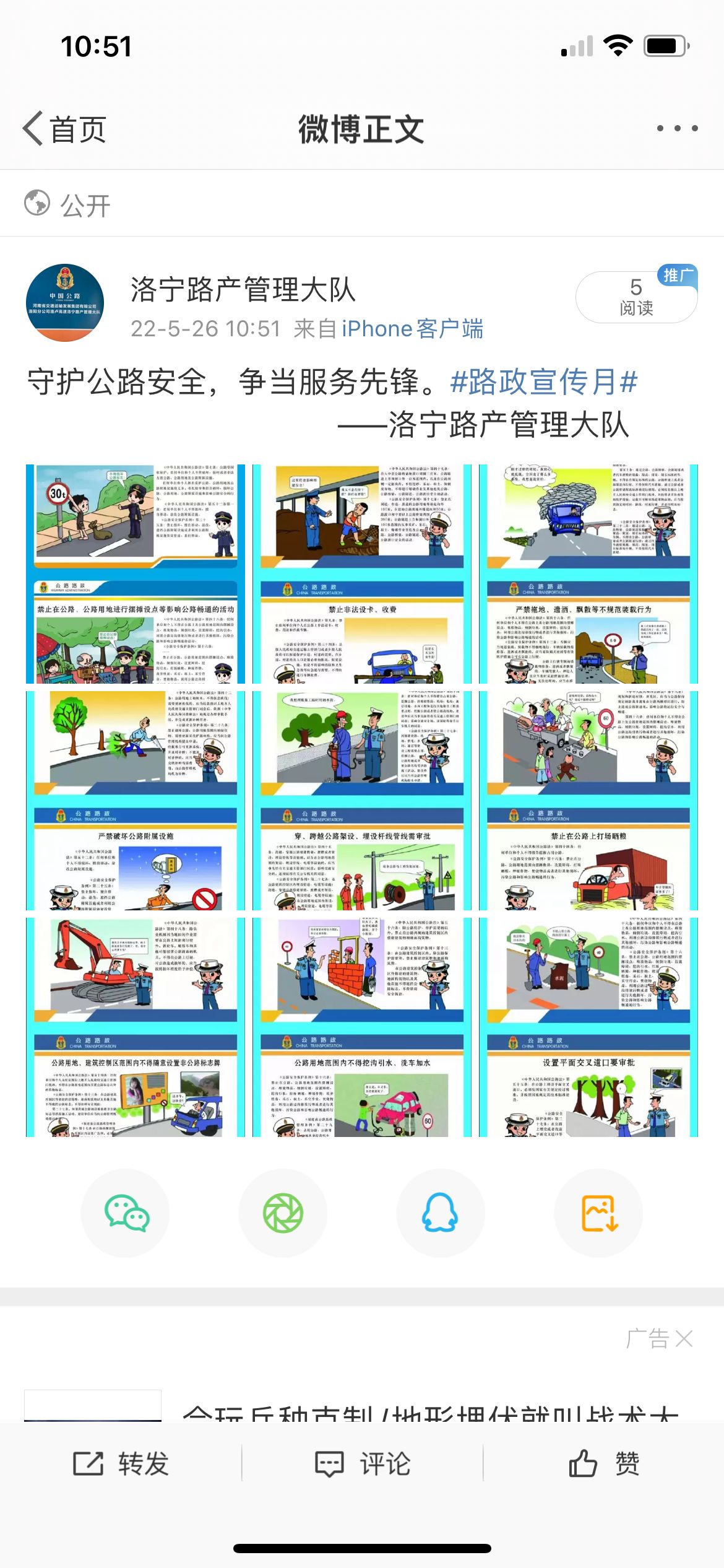 单位:洛宁路产大队 发布时间:2022-05-27为进一步加强高速公路路产管理法律法规和政策宣传解读工作,营造高速公路安全保护工作良好的社会环境,近日,洛阳分公司洛宁路产管理大队积极拓展宣传渠道,丰富宣传形式开展了以“保防疫、保畅通、保运输、保稳定”为核心,以“守护公路安全、争当服务先锋”为主题的路政宣传月活动。大队结合当地防疫政策“落实个人防护,不扎堆,不聚集,不到人员密集场所,抓好管控措施落实。”,充分发挥新媒体作用,拓宽宣传渠道。积极拓展“互联网+路产宣传”新模式。利用微信、微博、抖音等新媒体APP(客户端),普及公路安全保护法律法规和政策措施,突出路产管理工作对服务社会出行的重要作用,引导社会加强爱路护路意识。