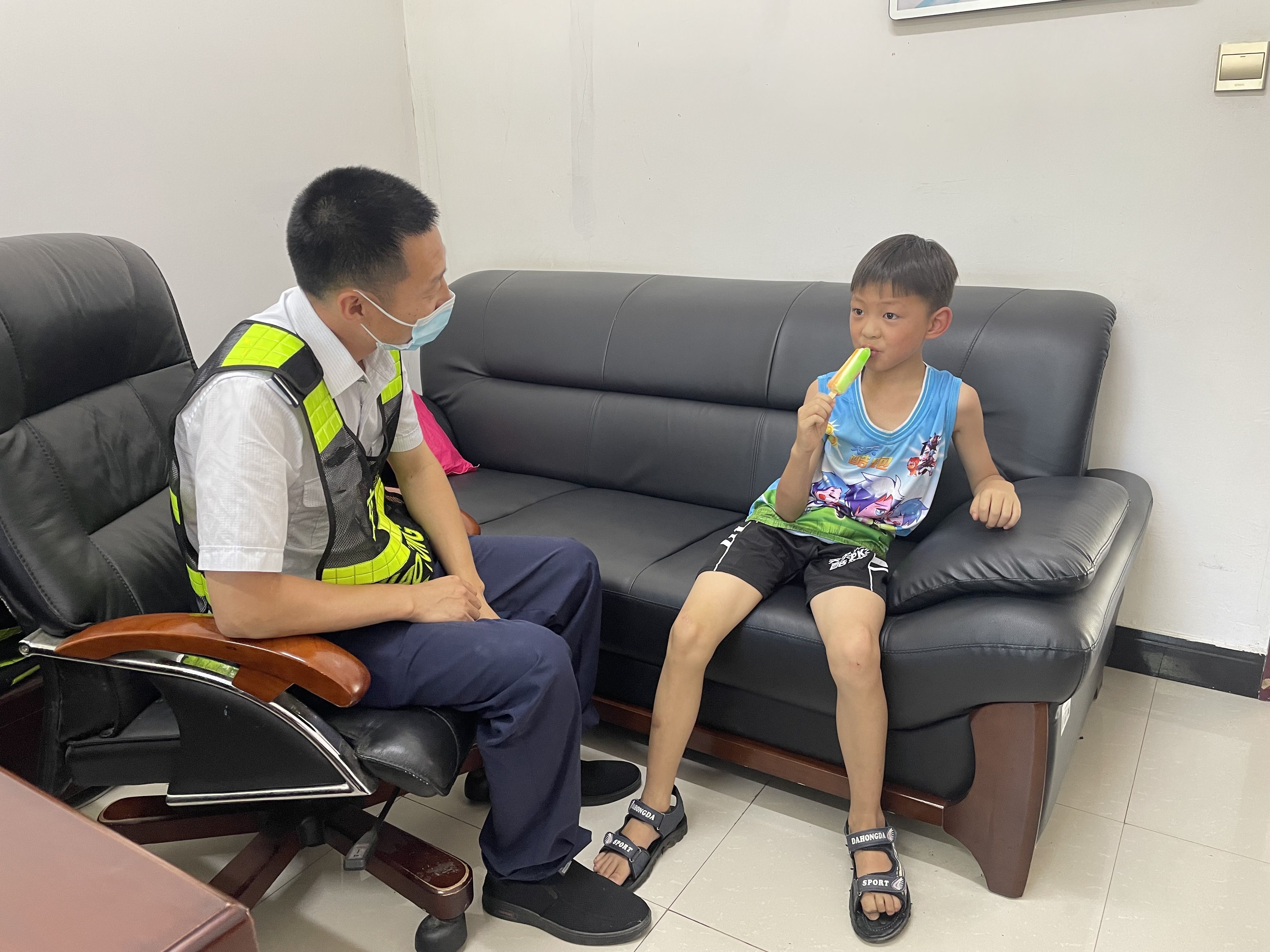 值班站长蹲下身子耐心询问小孩家人的联系方式,男孩说着便留下了委屈的眼泪;见此情况,值班站长立即他带到收费站办公室,给男孩递上零食和雪糕,安定孩子情绪。待孩子情绪稳定后,询问了男孩的姓名、家庭住址、家人信息等,最终与其家人获得联系,并等待家人来接小孩。虽然这只是我们日常工作中的小小的一个插曲,但却体现出高速人责任担当和乐于助人的精神。