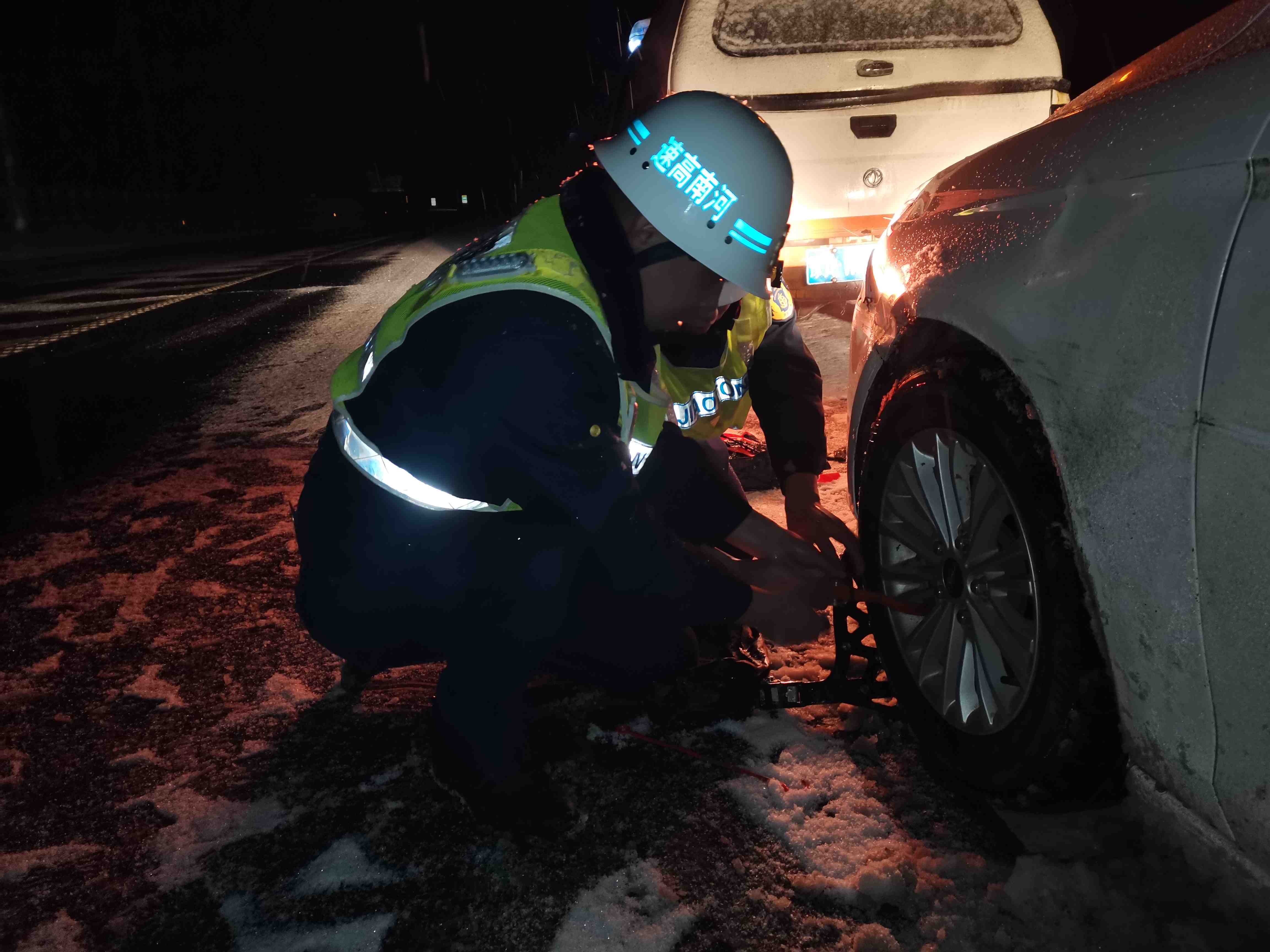 值班副大队长与巡查队员立即带上防滑链,驱车前往救援。夜间气温已经降至零下3°,路产人员不畏严寒,膝盖淹没在冰雪中为被困车辆安装防滑链,并采取带道通行的方法,护送司乘安全抵达木札岭收费站。收费站外焦急等待的家属看到高速路产人员护送他们的家人平安抵达时,非常感动,连连称赞。