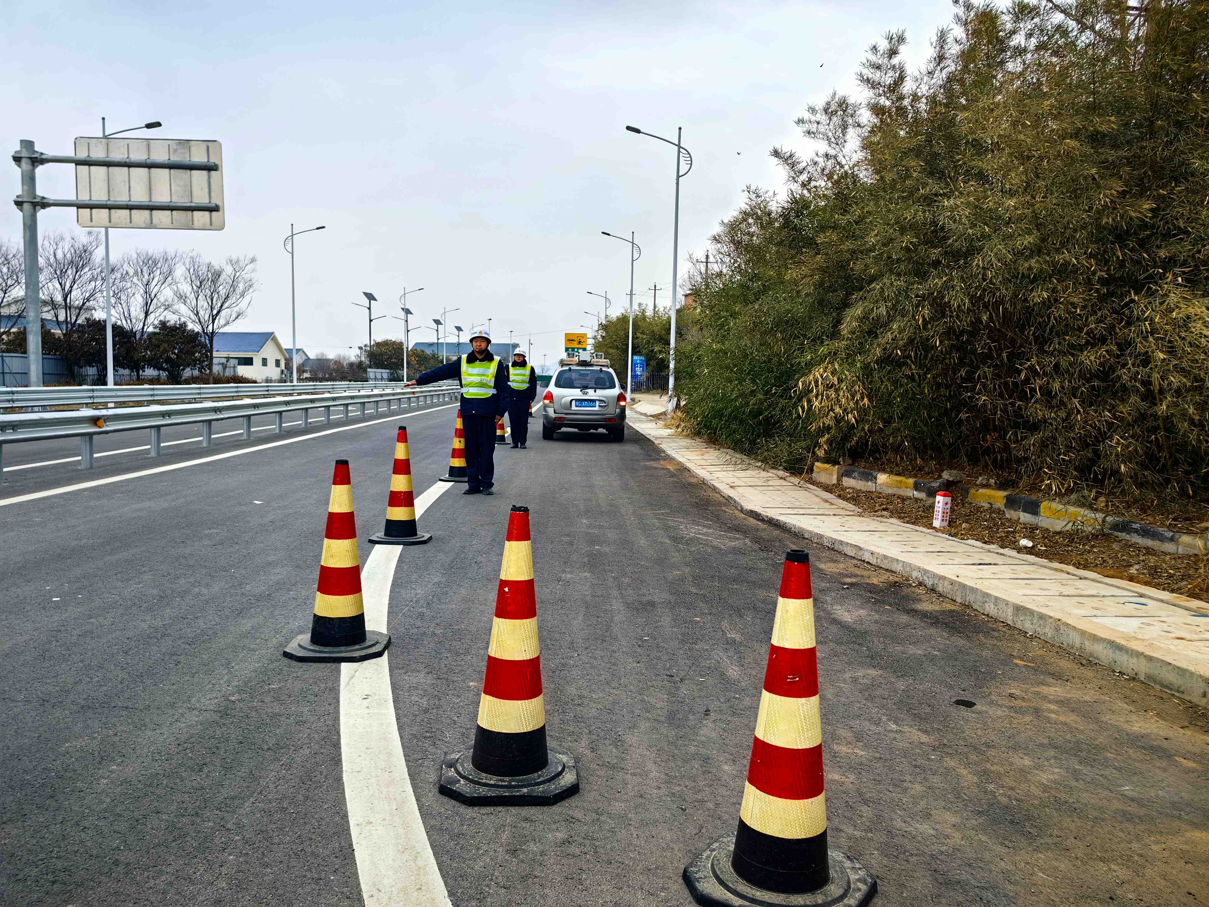 演练模拟:K50+200m处东半幅一辆小型客车因爆胎发生路产事故,路产巡查在接到报警电话后5分钟内出动,赶赴现场。到达现场后,巡逻车停放在事故车辆前方20m处,路产人员迅速在事故车辆后方150m外设置安全区(遇到弯道、桥梁、恶劣天气可以适当增加安全区长度和标志标牌),安全区封口处角度不小于135°,渐变段锥形标间距2m,缓冲区锥形标间距4m,一直摆到前方巡逻车处,摆放时路产人员面对来车方向,注意安全,留一名人员在封口处进行疏导指挥、观察瞭望,一名人员在安全区内,对路产损失进行勘验,以及对当事人信息的记录。事故处理完毕后,应迅速撤出所有的安全标志,留守一名人员指挥交通(清理顺序应与摆放安全标志顺序正好相反,即面向来车方向),所有安全标志撤出后,撤离现场。