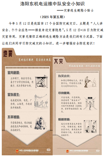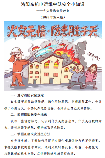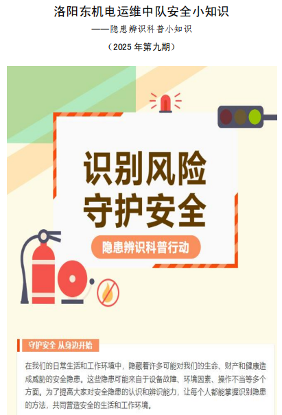 单位:洛阳东机电运维中队 发布时间:2025-06-13为进一步做好职工安全教育工作,洛阳东机电运维中队以当前安全生产月活动为契机,结合防汛工作、防灾减灾工作等具体要求,利用微信群开设,定期发送安全小知识。