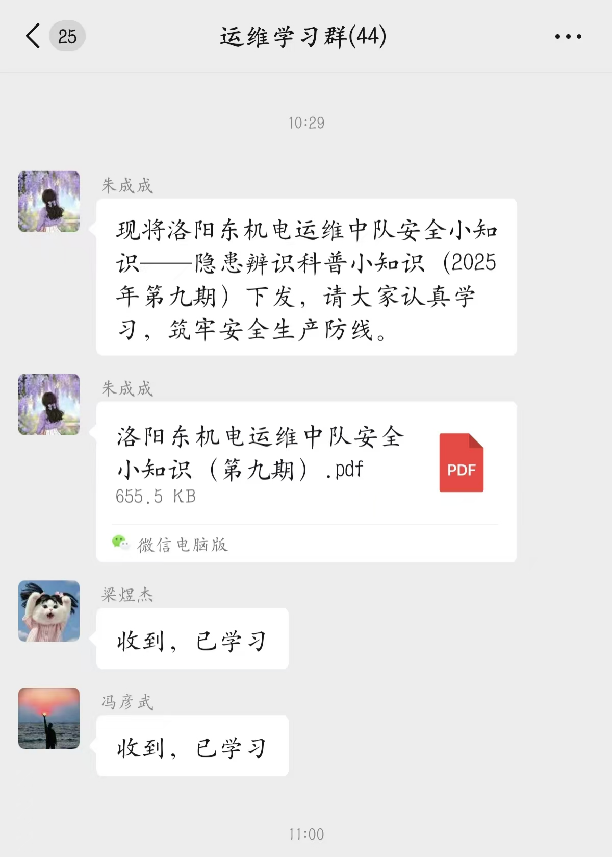 为进一步做好职工安全教育工作,洛阳东机电运维中队以当前安全生产月活动为契机,结合防汛工作、防灾减灾工作等具体要求,利用微信群开设,定期发送安全小知识。