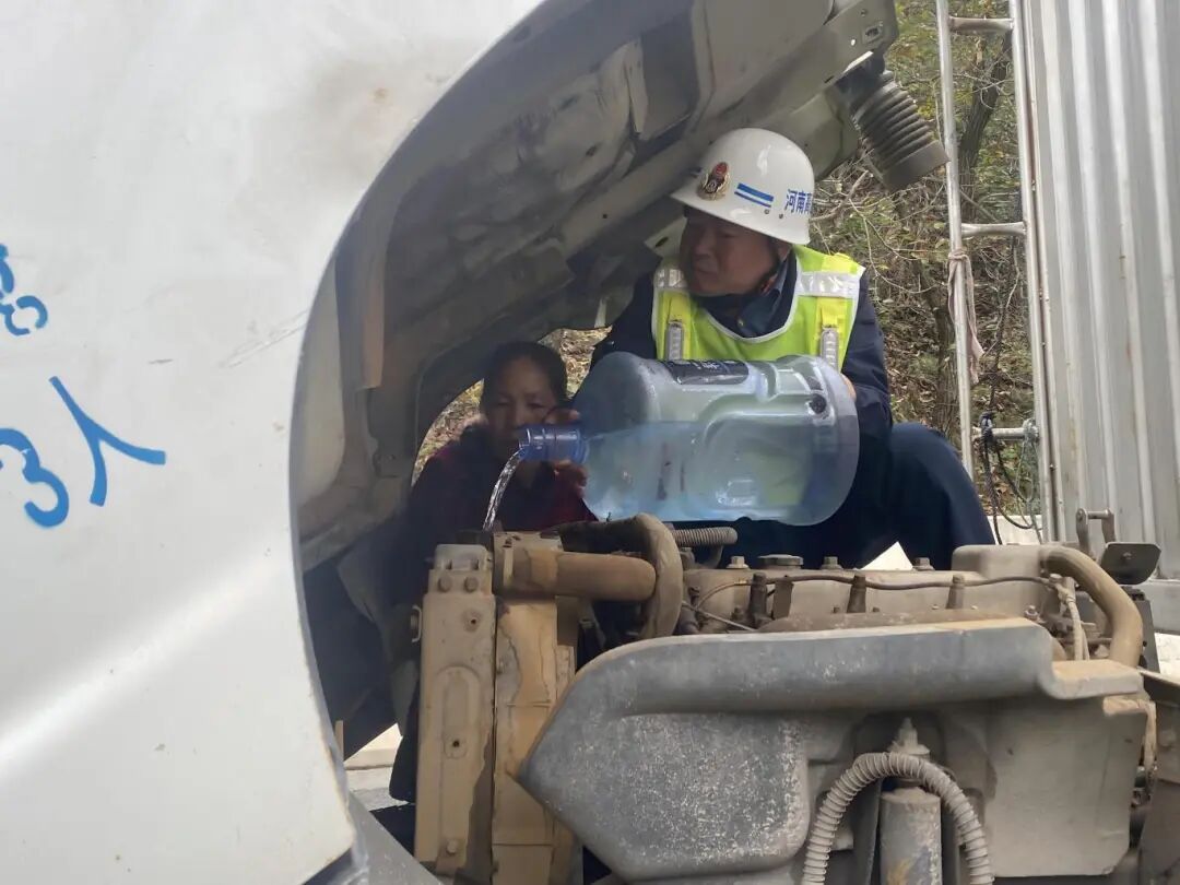 10月13日13时许,郑栾高速K253下行处,一辆货车因水箱漏水熄火,停靠行车道且未设警示标志。中队接报后迅速赶赴现场,第一时间布设警示标志,排查发现系司机未察觉水箱漏水致车辆抛锚。路产人员联合养护人员合力将货车推至应急车道,随后从巡逻车取备用桶装水为水箱补水,同时安抚司机情绪,讲解故障成因及行车检查要点。经紧急处置,货车水箱补水后恢复正常行驶。司机对路产人员及时救援表示感谢,称避免了货物运输延误。