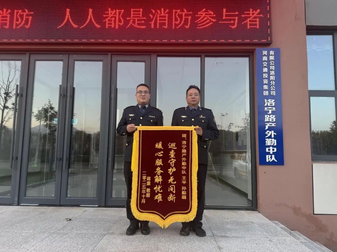 10月13日,中队收到来自三门峡的锦旗,印着“巡查守护无间断 暖心服务解忧难”,背后是一段国庆雨夜救援故事。10月1日23时,国庆假期雨夜车流高峰,中队长与当班班长巡查至K121+700m处,发现一辆小型客车因电量耗尽,由两人在应急车道缓慢推行,计划前往800米外的故县服务区充电。考虑到雨夜视线差、等待救援将延长司乘困境,两人当即冒雨协助推车,20分钟后将车辆安全推至服务区充电。安顿后,他们还向司乘宣讲清障救援政策,普及雨天行车安全知识,获司乘连声感谢。这面跨城锦旗,是对中队“急群众之所急”服务的肯定,更是路产人员坚守岗位、守护平安的生动见证。
