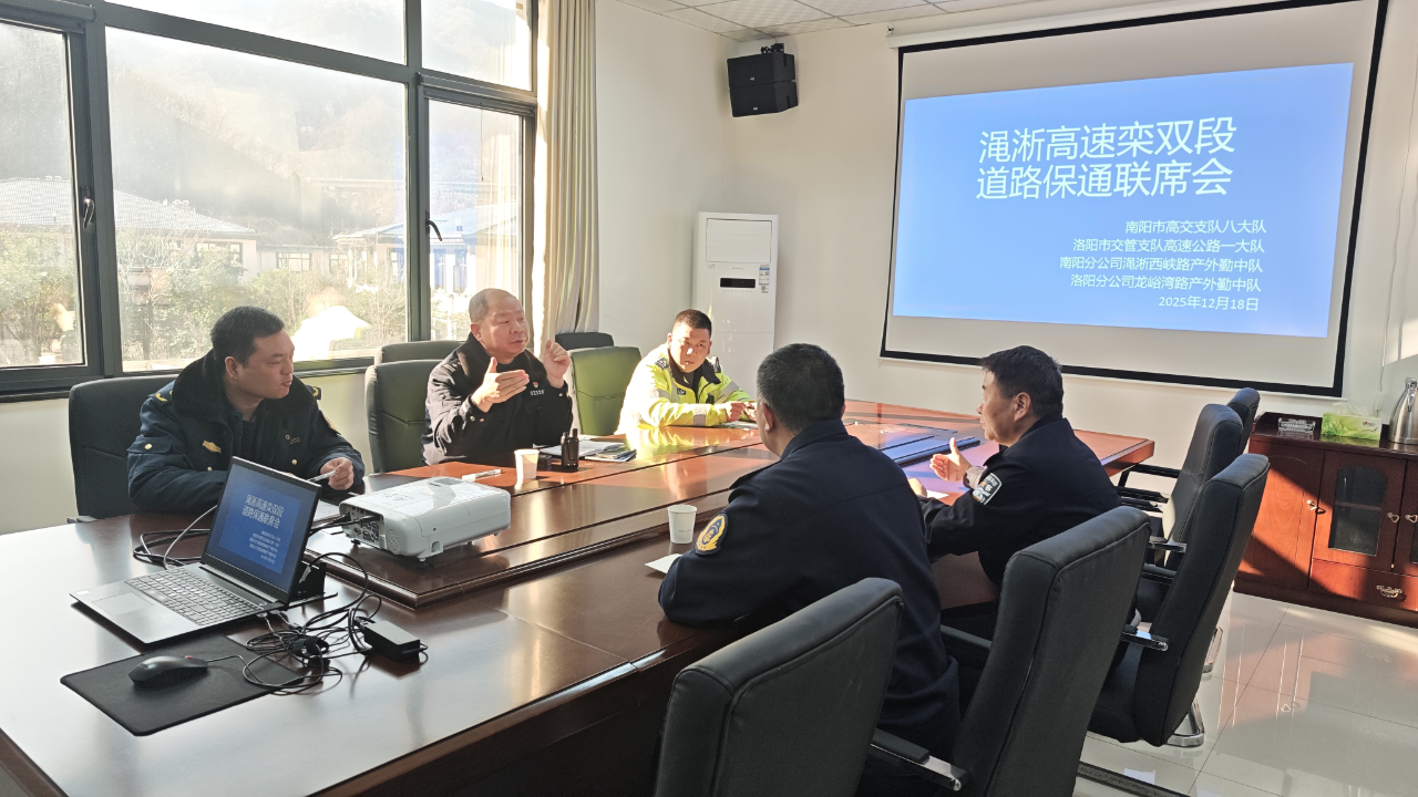单位:龙峪湾路产外勤中队 发布时间:2025-12-23近日,龙峪湾路产外勤中队联合南阳高速交警支队八大队、洛阳市交管支队高速公路一大队及南阳分公司渑淅高速西峡路产外勤中队,围绕保障老界岭特长隧道通行安全顺畅、提升协作处置效率核心目标,开展跨单位协同研讨与部署。