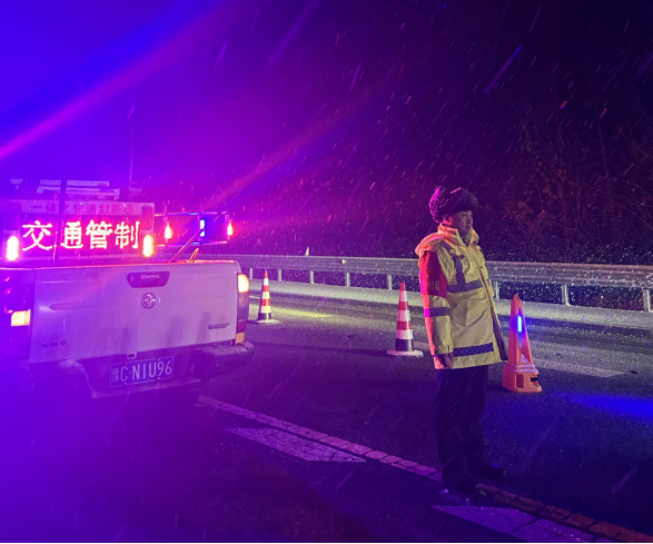 强冷空气导致辖区路面快速结冰后,中队立即启动应急预案,队长带领队员奔赴隧道口、桥梁、陡坡等关键路段定点值守,并大幅加密巡逻频次,动态掌握路况。通过高效联勤联动,协同养护部门调配设备物资,采取“机械除雪与人工撒布融雪剂”相结合的方式,开展高效除冰作业。寒夜中,队员们顶风冒雪,徒手清冰、布设标志、引导车辆,警灯闪烁映照着他们坚守的身影。从深夜到清晨的连续奋战,有力确保了管段道路的安全畅通。