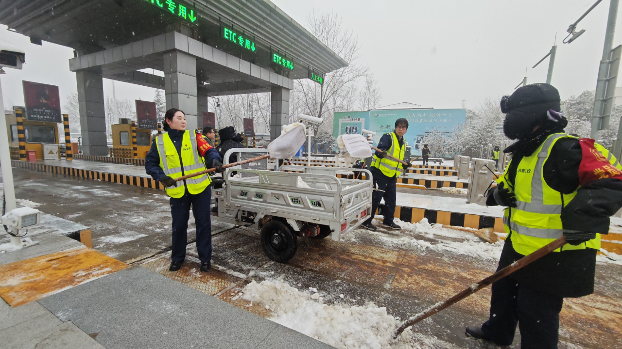“雪情即命令”,收费站干部职迅速响应集结,手持工具对收费站广场、车道及服务区展开“地毯式”清扫。现场人员默契配合,推雪、撒盐、清理死角,繁忙而有序。在全力除雪的同时,收费站通过多种渠道及时向司乘人员发布安全提示与路况信息,外勤人员加强巡查疏导,并为有需要的司乘提供热心帮助,在寒冬中传递温暖。