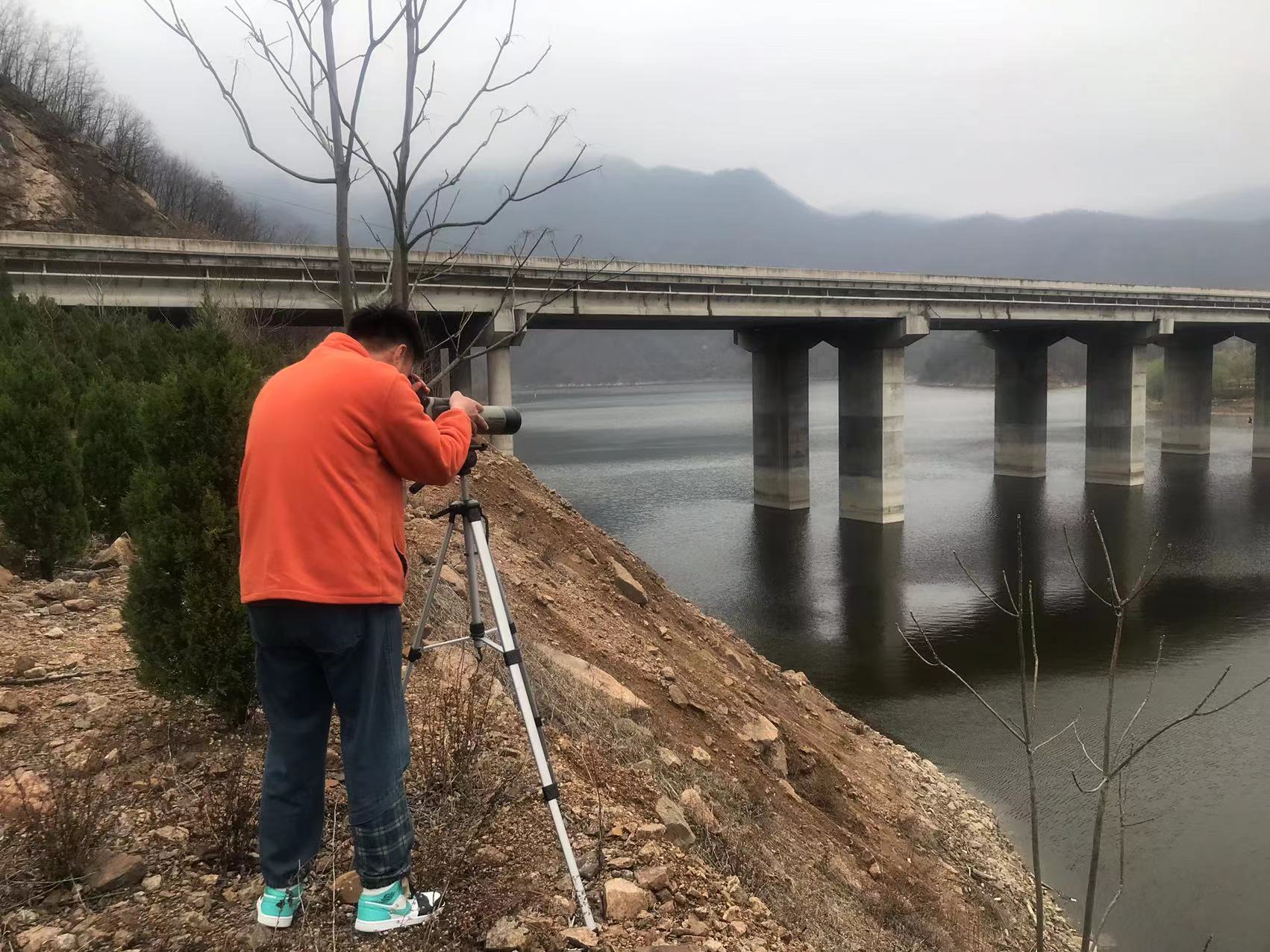 九龙山养护所雨后利用望远镜对桥梁下部结构情况进行观测。