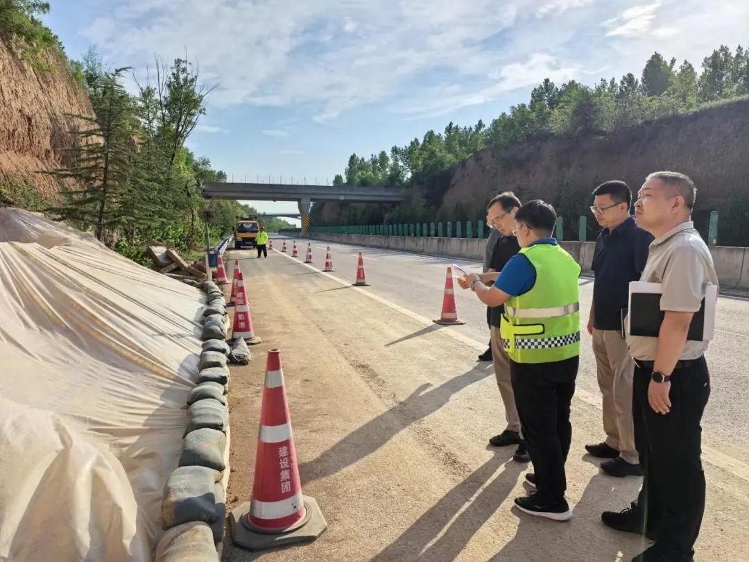 在施工现场,张书记听取了洛宁西养护管理所关于汛期养护工作情况的汇报,对其防汛举措给予充分肯定,并提出四点要求:一是筑牢风险防线,完善预警、排查、处置流程,强化桥隧结构物、高边坡等重点部位监测,加强关注曾经发生过灾毁的位置;二是加强物资及设备前置工作,强化防汛队伍实战演练,确保灾害发生时第一时间投入抢险;三是对K73+000路堑边坡滑坡点风险隐患部位设置的简易监控设备给与肯定,有利于提升风险识别精准性及处置及时性;四是严格落实汛期巡查制度,特殊天气加密巡查频次,确保第一时间掌握道路灾毁情况,发生突发事件果断进行交通管制,切实保障过往司乘生命财产完全。