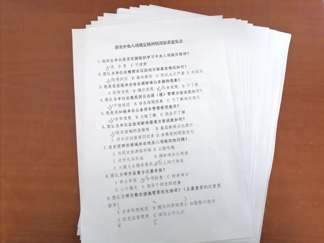 本次调查采取无记名问卷方式,围绕公务接待、公车管理、会议作风、文件简报、廉洁自律等方面设置多项选择题与开放式问题,力求全面掌握干部职工对八项规定执行情况的真实评价。活动共发放问卷24份,回收有效问卷24份,回收率达100%,反映出广大职工对作风建设的高度关注和积极参与。
