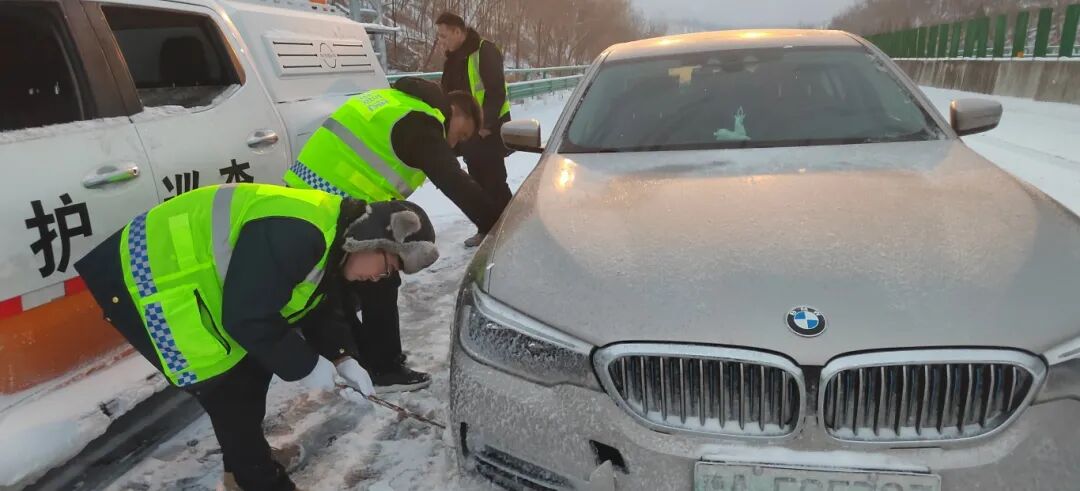 白云山站党支部:党员带头清扫收费车道、广场及周边道路积雪,出动除雪车机械化作业,及时撒布融雪剂防结冰,保障司乘通行安全。同时为滞留司乘免费发放泡面、火腿肠及热水,获一致好评。