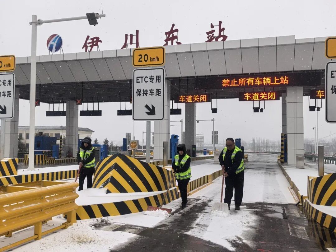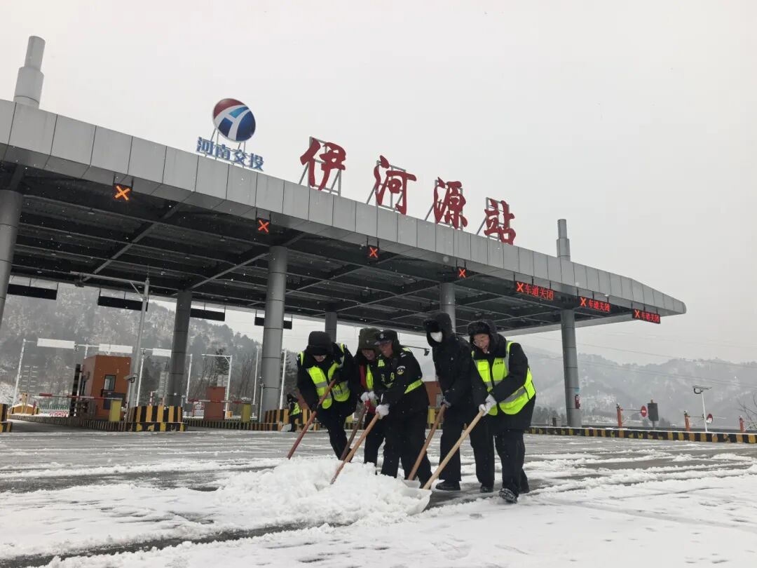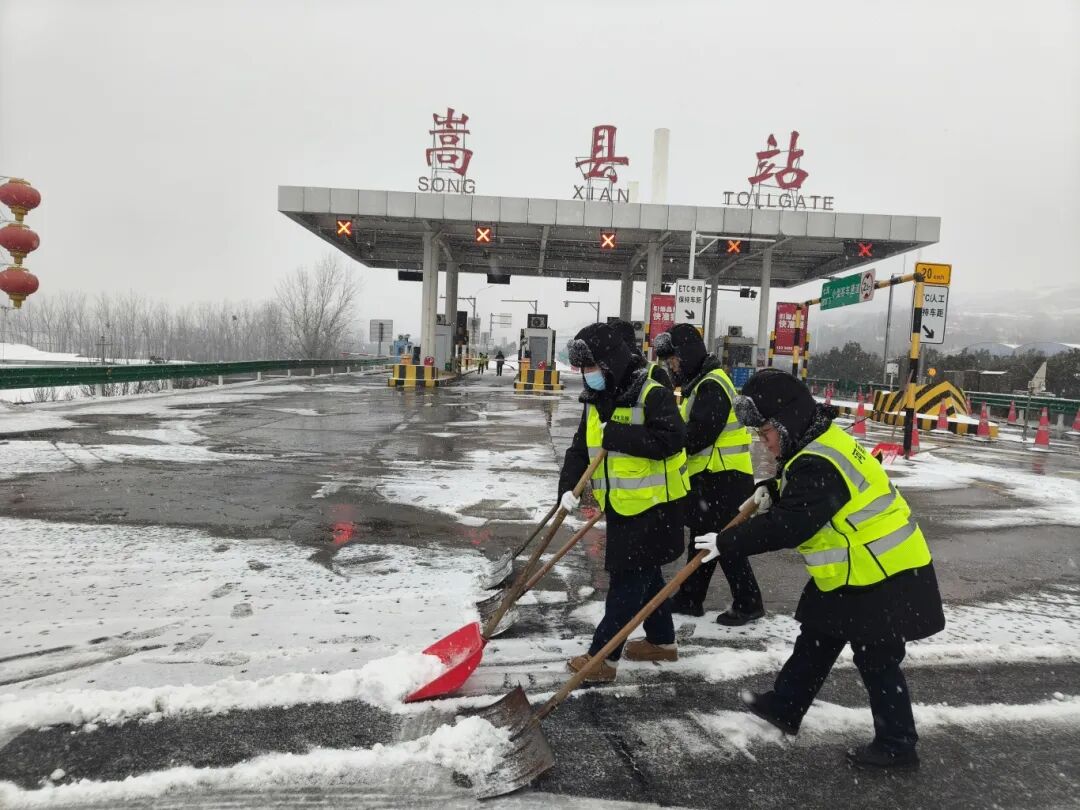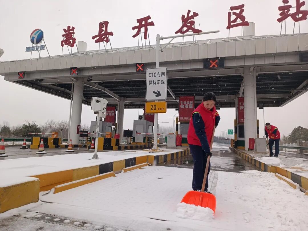 二里头收费站、康店收费站、回郭镇收费站:党员带头组建突击队,全体职工坚守岗位、分工协作,地毯式清理收费车道、广场积雪并科学撒布融雪剂,同时为滞留司乘送上热水、方便面等物资,保障道路通行顺畅。