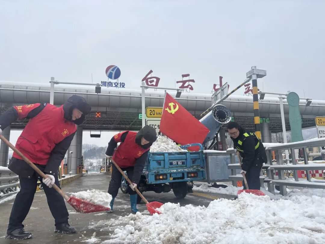 嵩县开发区站党支部:联合陆浑收费站迅速启动除雪保畅应急预案,党员干部带头奔赴保通一线,全体职工科学除雪,筑牢雪天出行安全防线。