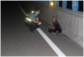 24日0时49分,接到过往司乘反映,有老人在高速上行走,情况十分危险。洛宁路政大队值班路政员迅速行动,赶往现场。1时25分,在洛卢高速K97+400(上行)公里处,发现瘫软在地的老人蜷缩于超车道里测,生命安全受到严重威胁。值班队员快速小心将老人搀扶上巡逻车并护送至长水收费站,及时为老人送上了包子和饮用水,老人体力逐渐恢复。与此同时,长水乡派出所和洛宁县救助站也已取得联系,2时03分,长水乡派出所到达现场对老人身份进行了确认。2时55分洛宁县救助站工作人员到达现场对老人进行转运,老人得到妥善安置。