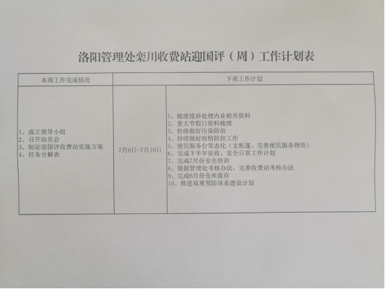 单位:栾川收费站 发布时间:2020-07-03栾川收费站根据《关于印发迎接“十三五”全国干线公路养护管理评价工作方案的通知》(豫交高洛【2020】32号)文件要求,立即成立迎国检领导小组,并召开动员大会。会议上组长周为同志向全体人员详细解读了文件内容,要求全体人员高度重视此次检查。此外,领导小组结合实际情况,制定了详细的迎检工作实施方案和迎检周计划表,会议要求小组成员严格按照方案和计划表有步骤、有落实地积极开展各项工作,确保如期高质量完成迎检任务。