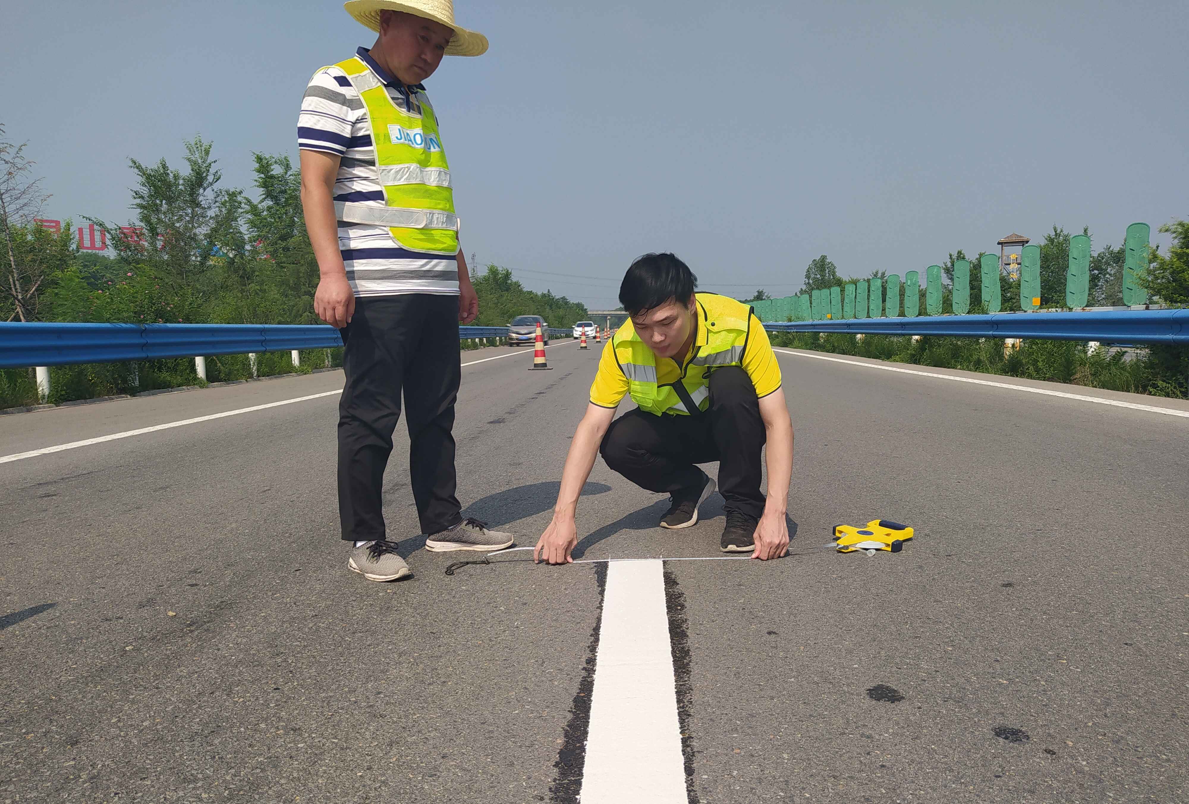 为保证洛卢高速上行K0-K1+500、下行K14+500-K5+980行车道分界线施工标线施工质量,周山养护管理所交安负责人对现场施工进行跟踪测量,所抽查测量标线长600cm,宽15cm,间隔900cm规格均符合施工要求。