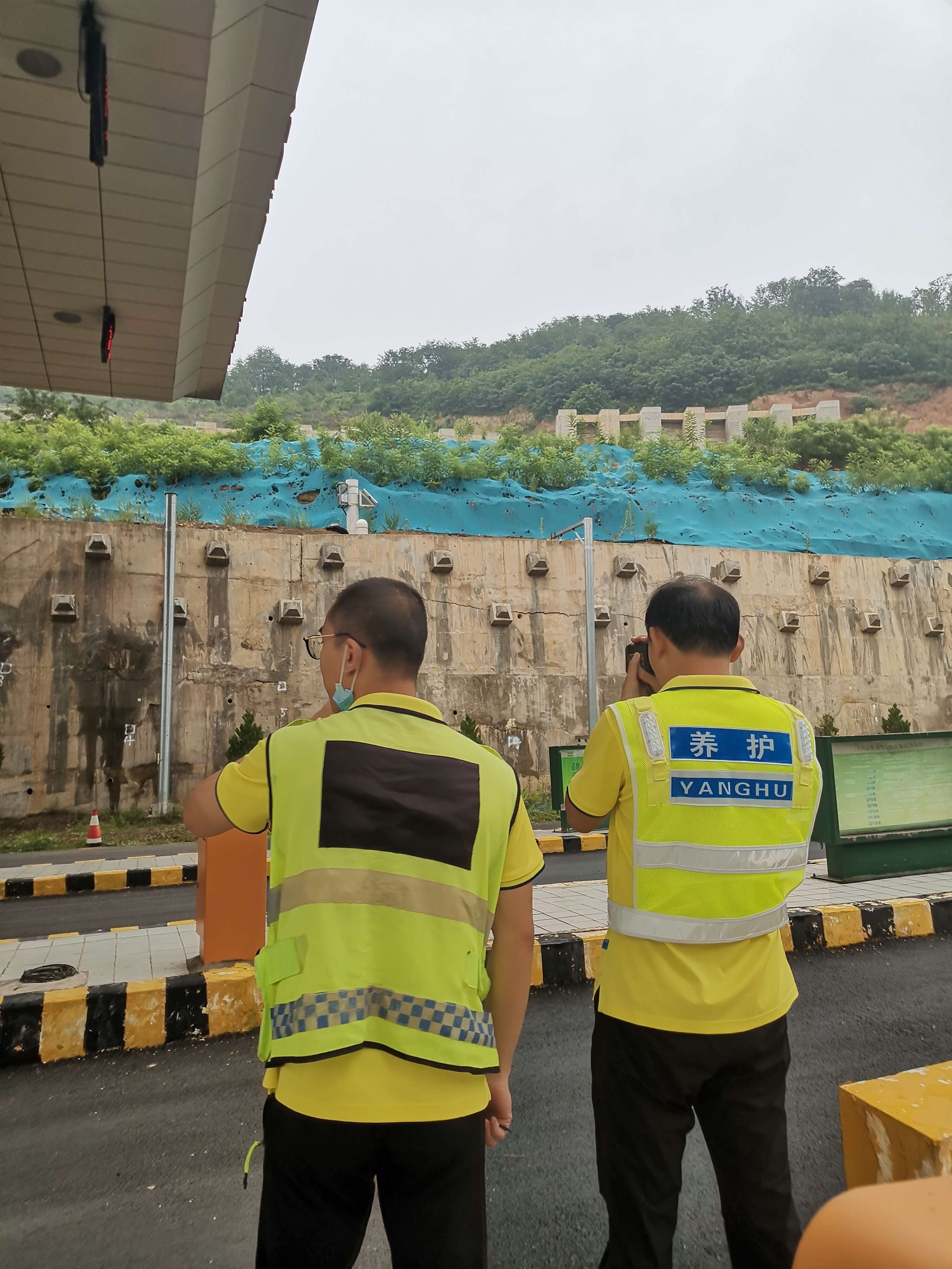 由于近期连续降雨,养护管理所加强了对上戈收费站滑坡病害风险隐患点的跟踪观测,通过对护坡滑移情况、挡墙裂缝以及挡墙位移发展情况等详细观测和记录,跟踪病害变化情况,为做好灾害预防和病害的进一步处置提供了重要依据。