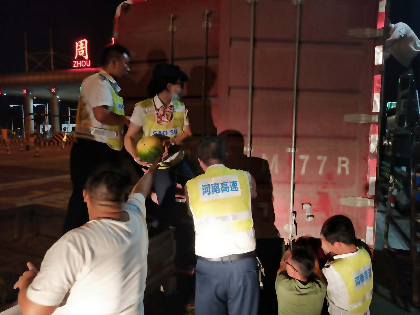 一货车通过周山收费站时后门挂钩损坏,所装载西瓜掉落,紧急情况下,周山收费站组织所有在站职工帮助车主对西瓜进行转移,由于处置得当,及时帮助车主避免了货物损失,为表示感谢,8月10日上午,司机特意赶来送上了一面锦旗。