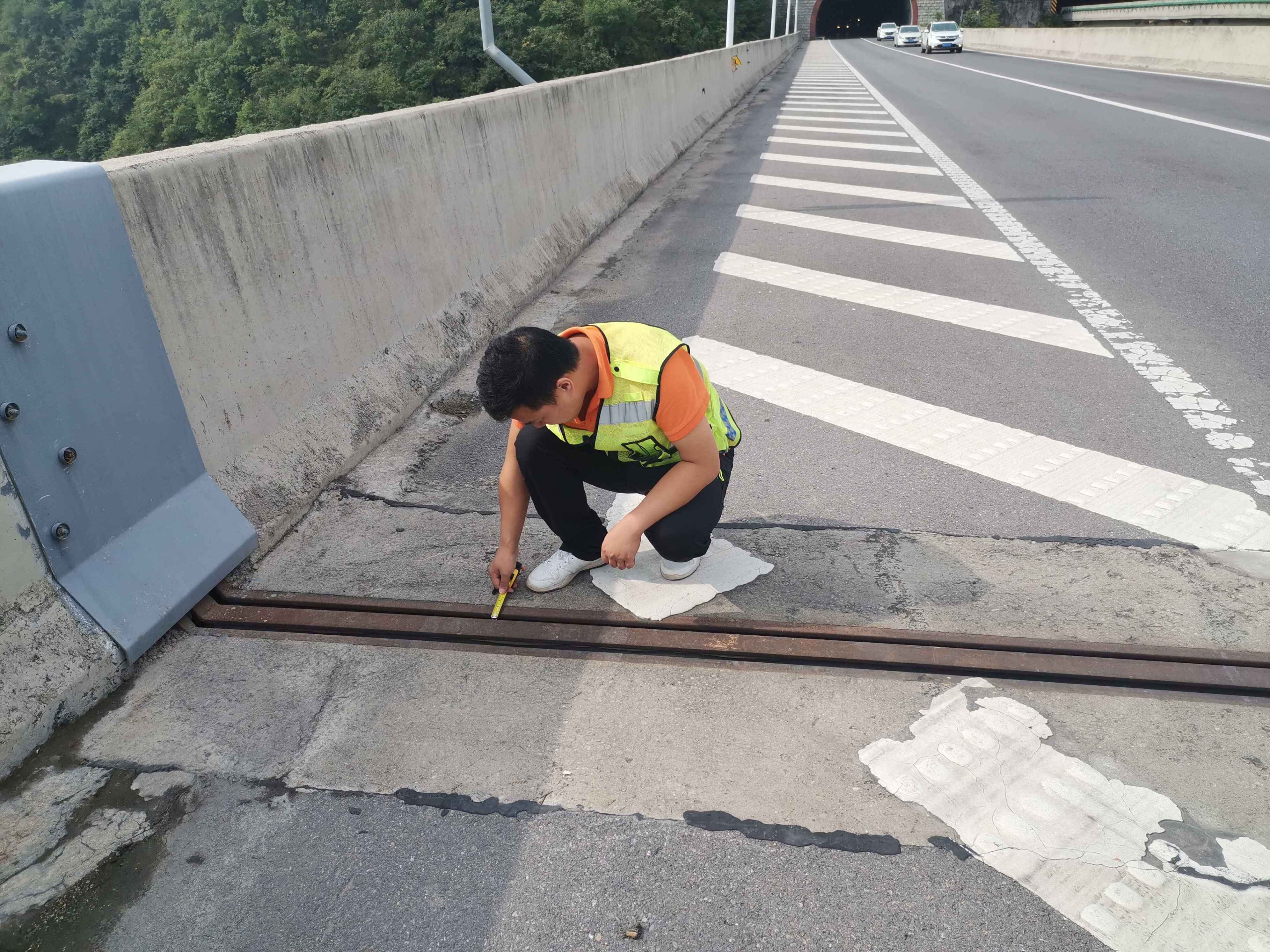 为第一时间掌握沿线桥隧结构物情况,九龙山养护管理所对辖区大桥伸缩缝变形型钢进行观测和测量,及时掌握伸缩缝健康信息。