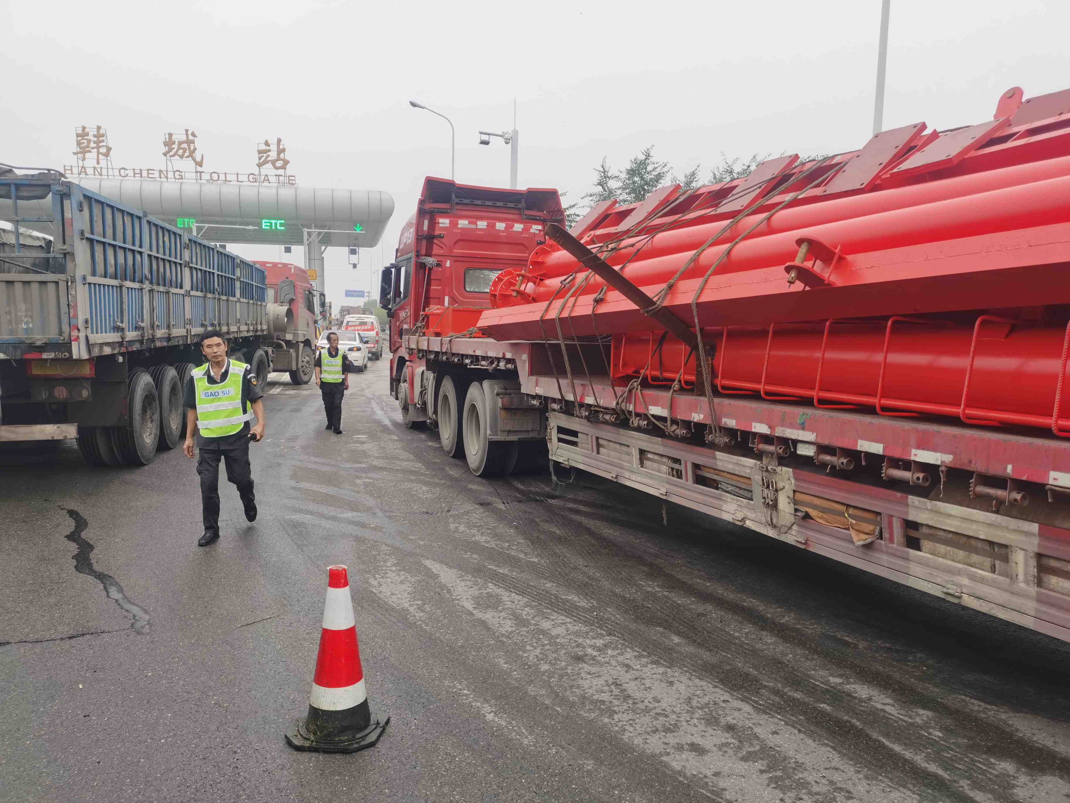 8月23日中午,韩城收费站103混合车道出口处,一辆满载钢制设备的六轴货车在下道时因货物侧倾将货车围栏压弯,导致货物发生位移,情况紧急。收费员发现情况后立刻封闭车道,设置安全区,安全专人做好后方车辆疏导,经过货物加固处理、耐心指挥引导,车辆最终安全通过收费站,由于发现及时,处置得当,在帮助货车司机及时处置险情的同时,避免了收费站车辆拥挤。