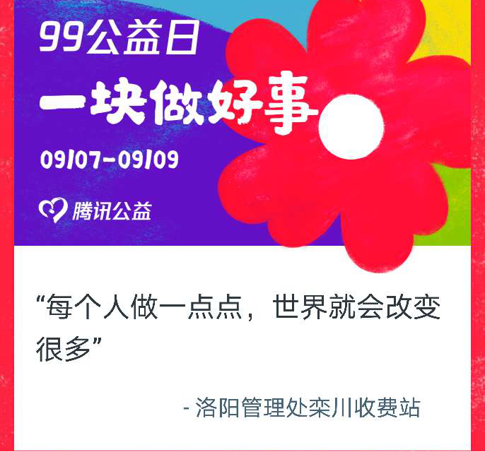 栾川收费站积极响应腾讯公益“99公益日”活动倡议,充分动员全站员工积极参与到公益活动中,喊出“每个人做一点点,世界就改变很多”的“一起做好事”公益口号,号召并引导职工投身公益事业,贡献自己的爱心力量,一起努力,让世界更美好。