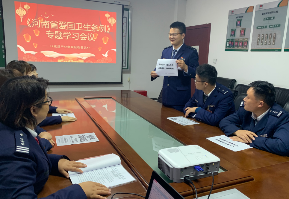 10月13日,嵩县产业集聚区收费站组织在站人员学习《河南省爱国卫生条例》,全面建设无烟单位。在站区开展爱卫宣传,动员全体人员革除陋习,从我做起,倡导健康生活方式。