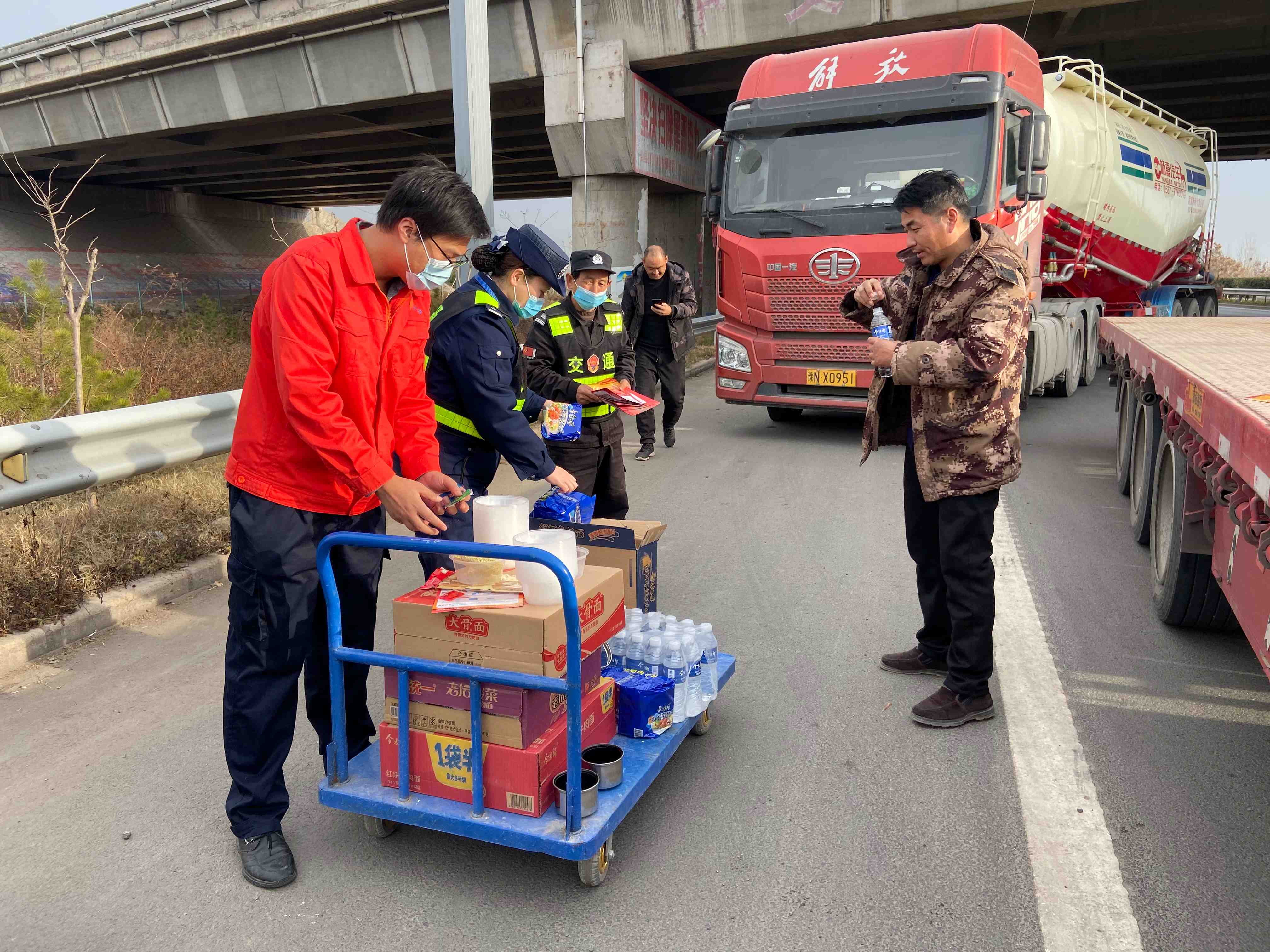 单位:嵩县运维大队 发布时间:2020-12-1112月10日,受大雾天气影响,全省高速公路实行交通管制措施。封道期间,不少大货车在收费站口等待道路开通。嵩县机电运维大队联合收费站积极行动,主动为站口等待的司乘人员送去了方便面、热水等物品,并叮嘱司乘人员耐心等待、注意安全。此举不仅解决了司乘人员的就餐问题,而且缓解了焦急等待的不良情绪,展现了我处良好的服务形象。