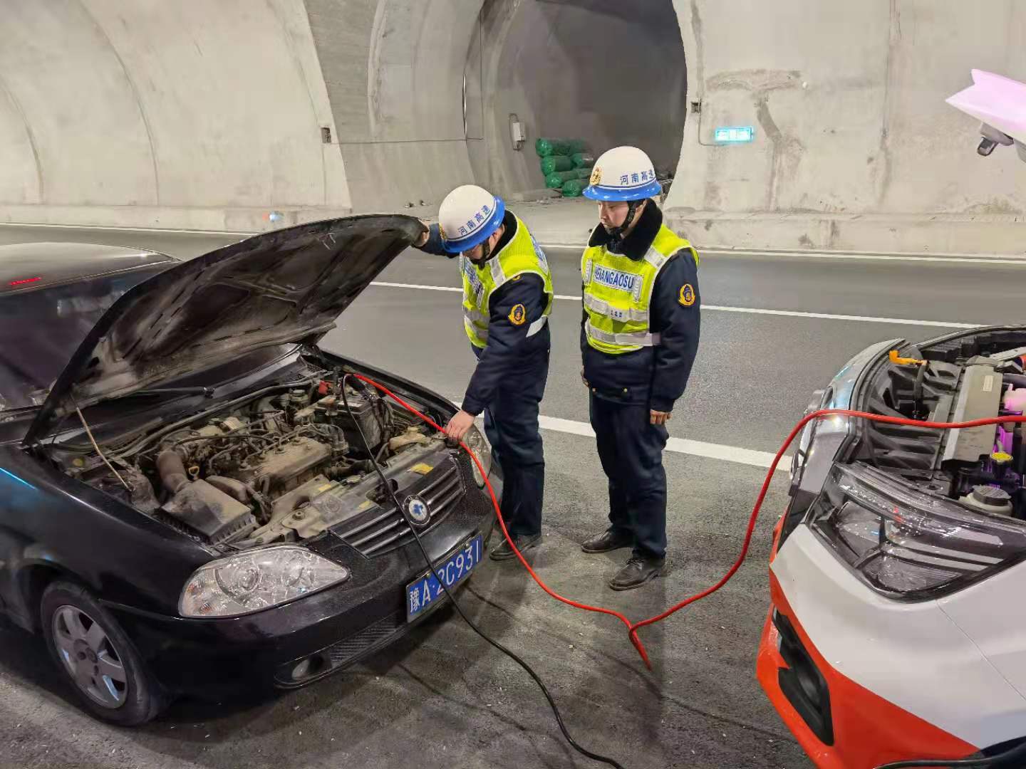 2021年1月26日14时10分尧山西路产大队巡查人员由东向西方向正常巡查至S88郑西高速K208+200m(上行)木扎岭隧道北半幅时发现紧急停车港湾内滞留一辆小型客车,巡逻人员停车前去查看询问。该车辆因电瓶故障无法行驶,了解情况后迅速设置安全区,主动取出巡逻车辆随车携带的电瓶连接线帮助司机搭接连电,14时13分,车辆启动,故障排除后安全驶离。