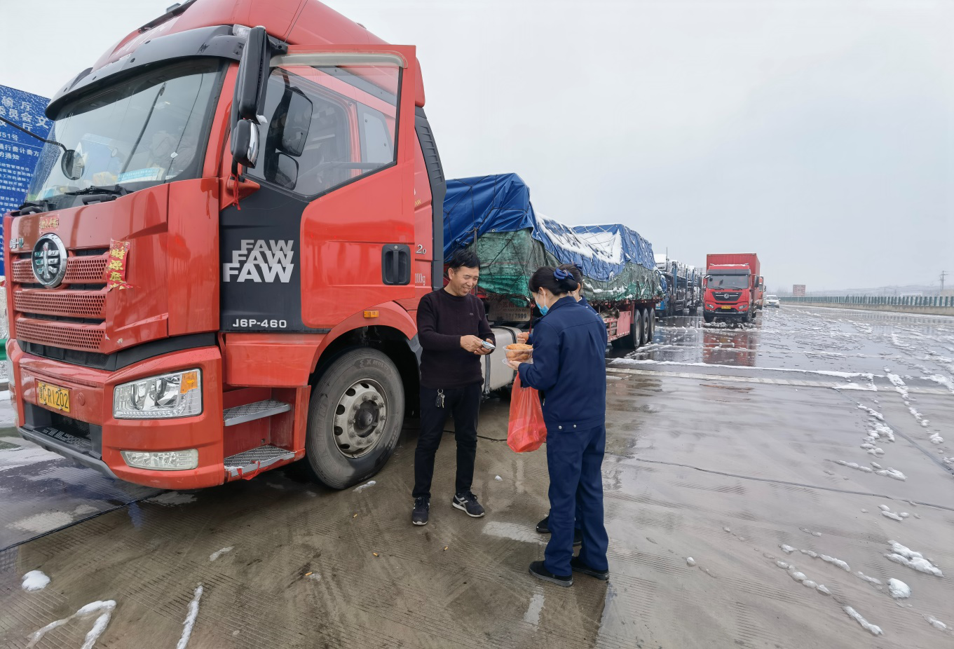单位:洛龙收费站 发布时间:2021-02-252月24日傍晚,洛阳市普降大雪。因高速不具备正常通行条件,洛龙收费站按照管控要求封闭上道口,站区外广场滞留10多辆外地货车。2月25日早上8点,洛龙收费站组织人员为仍然在站口等待的司乘人员送去了牛奶、鸡蛋、油饼等,为滞留司乘人员解决就餐问题,让司乘感受到来自收费站的温暖。